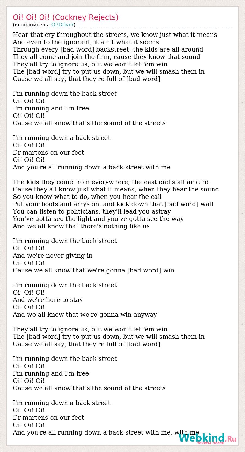 Hear that cry throughout the streets, we know just what it means And even to the ignorant, it ain't what it seems Through every [bad word] backstreet, the kids are all around They all come and join the firm, cause they know that sound They all try to ignore us, but we won't let 'em win The [bad word] try to put us down, but we will smash them in Cause we all say, that they're full of [bad word] I'm running down the back street Oi! Oi! Oi! I'm running and I'm free Oi! Oi! Oi! Cause we all know that's the sound of the streets I'm running down a back street Oi! Oi! Oi! Dr martens on our feet Oi! Oi! Oi! And you're all running down a back street with me The kids they come from everywhere, the east end’s all around Cause they all know just what it means, when they hear the sound So you know what to do, when you hear the call Put your boots and arrys on, and kick down that [bad word] wall You can listen to politicians, they'll lead you astray You've gotta see the light and you've gotta see the way And we all know that there's nothing like us I'm running down the back street Oi! Oi! Oi! And we're never giving in Oi! Oi! Oi! Cause we all know that we're gonna [bad word] win I'm running down the back street Oi! Oi! Oi! And we're here to stay Oi! Oi! Oi! And we all know that we're gonna win anyway They all try to ignore us, but we won't let 'em win The [bad word] try to put us down, but we will smash them in Cause we all say, that they're full of [bad word] I'm running down the back street Oi! Oi! Oi! I'm running and I'm free Oi! Oi! Oi! Cause we all know that's the sound of the streets I'm running down a back street Oi! Oi! Oi! Dr martens on our feet Oi! Oi! Oi! And you're all running down a back street with me, with me