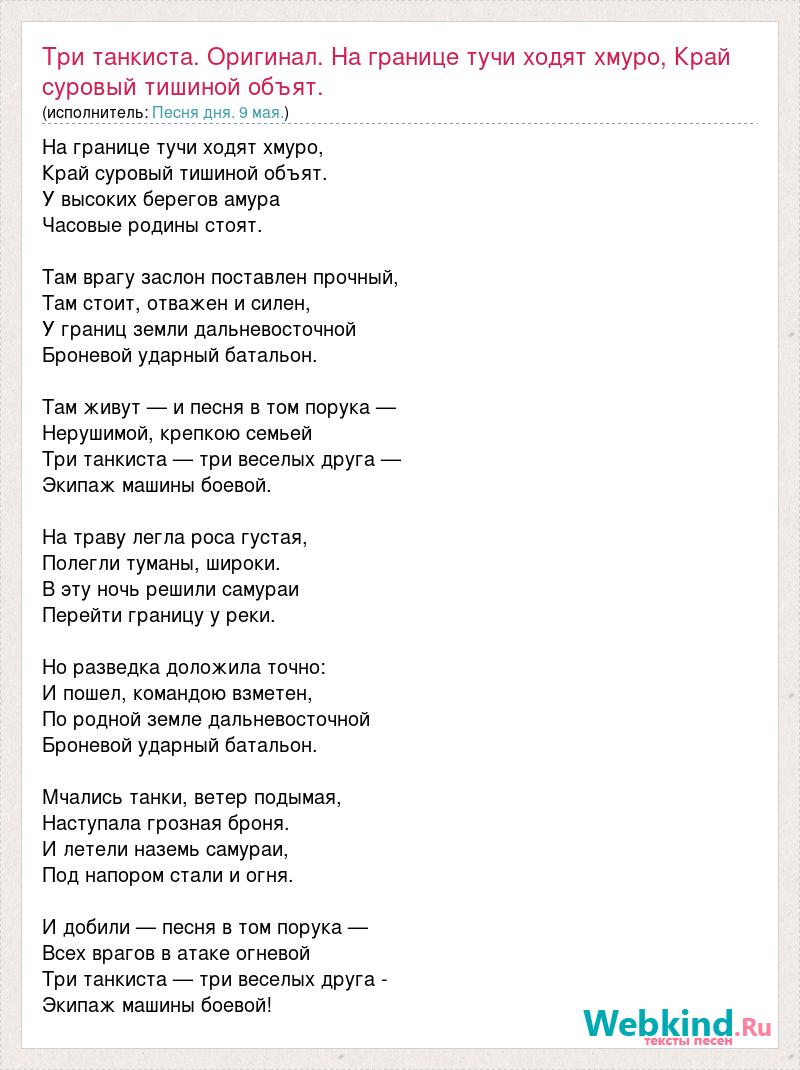 На границе тучи ходят хмуро, Край суровый тишиной объят. У высоких берегов амура Часовые родины стоят. Там врагу заслон поставлен прочный, Там стоит, отважен и силен, У границ земли дальневосточной Броневой ударный батальон. Там живут — и песня в том порука — Нерушимой, крепкою семьей Три танкиста — три веселых друга — Экипаж машины боевой. На траву легла роса густая, Полегли туманы, широки. В эту ночь решили самураи Перейти границу у реки. Но разведка доложила точно: И пошел, командою взметен, По родной земле дальневосточной Броневой ударный батальон. Мчались танки, ветер подымая, Наступала грозная броня. И летели наземь самураи, Под напором стали и огня. И добили — песня в том порука — Всех врагов в атаке огневой Три танкиста — три веселых друга - Экипаж машины боевой!
