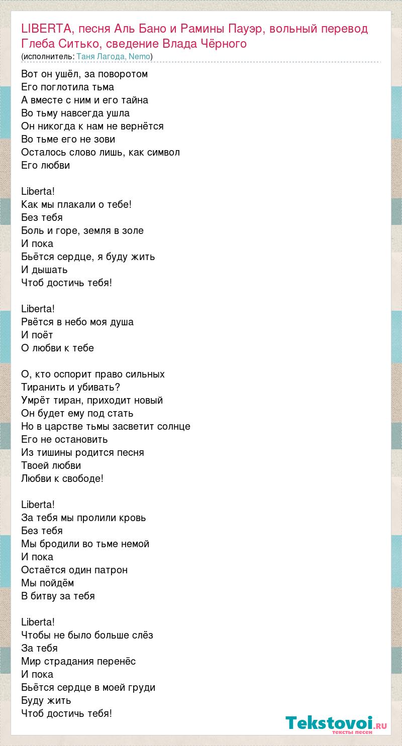 Вот он ушёл, за поворотом Его поглотила тьма А вместе с ним и его тайна Во тьму навсегда ушла Он никогда к нам не вернётся Во тьме его не зови Осталось слово лишь, как символ Его любви Liberta! Как мы плакали о тебе! Без тебя Боль и горе, земля в золе И пока Бьётся сердце, я буду жить И дышать Чтоб достичь тебя! Liberta! Рвётся в небо моя душа И поёт О любви к тебе О, кто оспорит право сильных Тиранить и убивать? Умрёт тиран, приходит новый Он будет ему под стать Но в царстве тьмы засветит солнце Его не остановить Из тишины родится песня Твоей любви Любви к свободе! Liberta! За тебя мы пролили кровь Без тебя Мы бродили во тьме немой И пока Остаётся один патрон Мы пойдём В битву за тебя Liberta! Чтобы не было больше слёз За тебя Мир страдания перенёс И пока Бьётся сердце в моей груди Буду жить Чтоб достичь тебя!