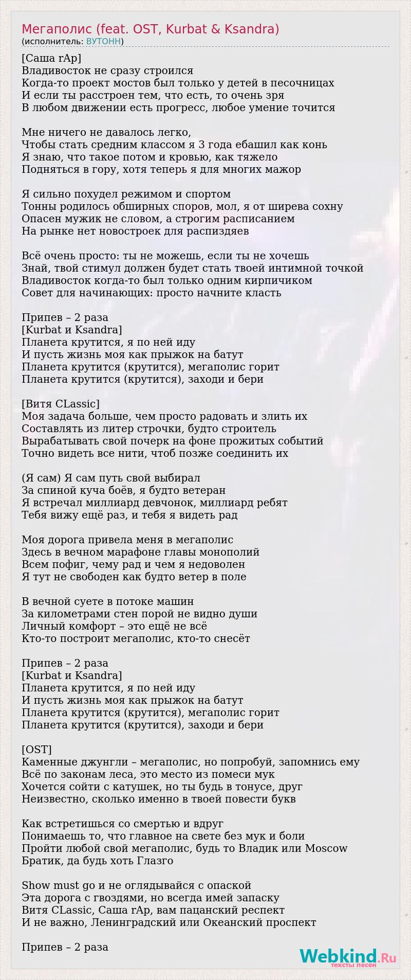 [Саша rAp] Владивосток не сразу строился Когда-то проект мостов был только у детей в песочницах И если ты расстроен тем, что есть, то очень зря В любом движении есть прогресс, любое умение точится Мне ничего не давалось легко, Чтобы стать средним классом я 3 года ебашил как конь Я знаю, что такое потом и кровью, как тяжело Подняться в гору, хотя теперь я для многих мажор Я сильно похудел режимом и спортом Тонны родилось обширных споров, мол, я от ширева сохну Опасен мужик не словом, а строгим расписанием На рынке нет новостроек для распиздяев Всё очень просто: ты не можешь, если ты не хочешь Знай, твой стимул должен будет стать твоей интимной точкой Владивосток когда-то был только одним кирпичиком Совет для начинающих: просто начните класть Припев – 2 раза [Kurbat и Ksandra] Планета крутится, я по ней иду И пусть жизнь моя как прыжок на батут Планета крутится (крутится), мегаполис горит Планета крутится (крутится), заходи и бери [Витя CLassic] Моя задача больше, чем просто радовать и злить их Составлять из литер строчки, будто строитель Вырабатывать свой почерк на фоне прожитых событий Точно видеть все нити, чтоб позже соединить их (Я сам) Я сам путь свой выбирал За спиной куча боёв, я будто ветеран Я встречал миллиард девчонок, миллиард ребят Тебя вижу ещё раз, и тебя я видеть рад Моя дорога привела меня в мегаполис Здесь в вечном марафоне главы монополий Всем пофиг, чему рад и чем я недоволен Я тут не свободен как будто ветер в поле В вечной суете в потоке машин За километрами стен порой не видно души Личный комфорт – это ещё не всё Кто-то построит мегаполис, кто-то снесёт Припев – 2 раза [Kurbat и Ksandra] Планета крутится, я по ней иду И пусть жизнь моя как прыжок на батут Планета крутится (крутится), мегаполис горит Планета крутится (крутится), заходи и бери [OST] Каменные джунгли – мегаполис, но попробуй, запомнись ему Всё по законам леса, это место из помеси мук Хочется сойти с катушек, но ты будь в тонусе, друг Неизвестно, сколько именно в твоей повести букв Как встретишься со смертью и вдруг Понимаешь то, что главное на свете без мук и боли Пройти любой свой мегаполис, будь то Владик или Moscow Братик, да будь хоть Глазго Show must go и не оглядывайся с опаской Эта дорога с гвоздями, но всегда имей запаску Витя CLassic, Саша rAp, вам пацанский респект И не важно, Ленинградский или Океанский проспект Припев – 2 раза