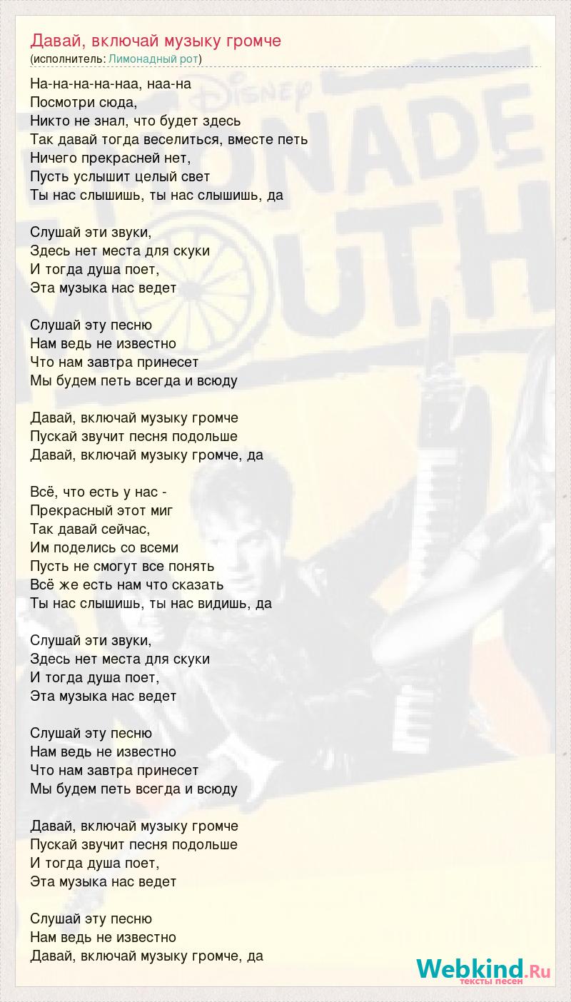 На-на-на-на-наа, наа-на Посмотри сюда, Никто не знал, что будет здесь Так давай тогда веселиться, вместе петь Ничего прекрасней нет, Пусть услышит целый свет Ты нас слышишь, ты нас слышишь, да Слушай эти звуки, Здесь нет места для скуки И тогда душа поет, Эта музыка нас ведет Слушай эту песню Нам ведь не известно Что нам завтра принесет Мы будем петь всегда и всюду Давай, включай музыку громче Пускай звучит песня подольше Давай, включай музыку громче, да Всё, что есть у нас - Прекрасный этот миг Так давай сейчас, Им поделись со всеми Пусть не смогут все понять Всё же есть нам что сказать Ты нас слышишь, ты нас видишь, да Слушай эти звуки, Здесь нет места для скуки И тогда душа поет, Эта музыка нас ведет Слушай эту песню Нам ведь не известно Что нам завтра принесет Мы будем петь всегда и всюду Давай, включай музыку громче Пускай звучит песня подольше И тогда душа поет, Эта музыка нас ведет Слушай эту песню Нам ведь не известно Давай, включай музыку громче, да