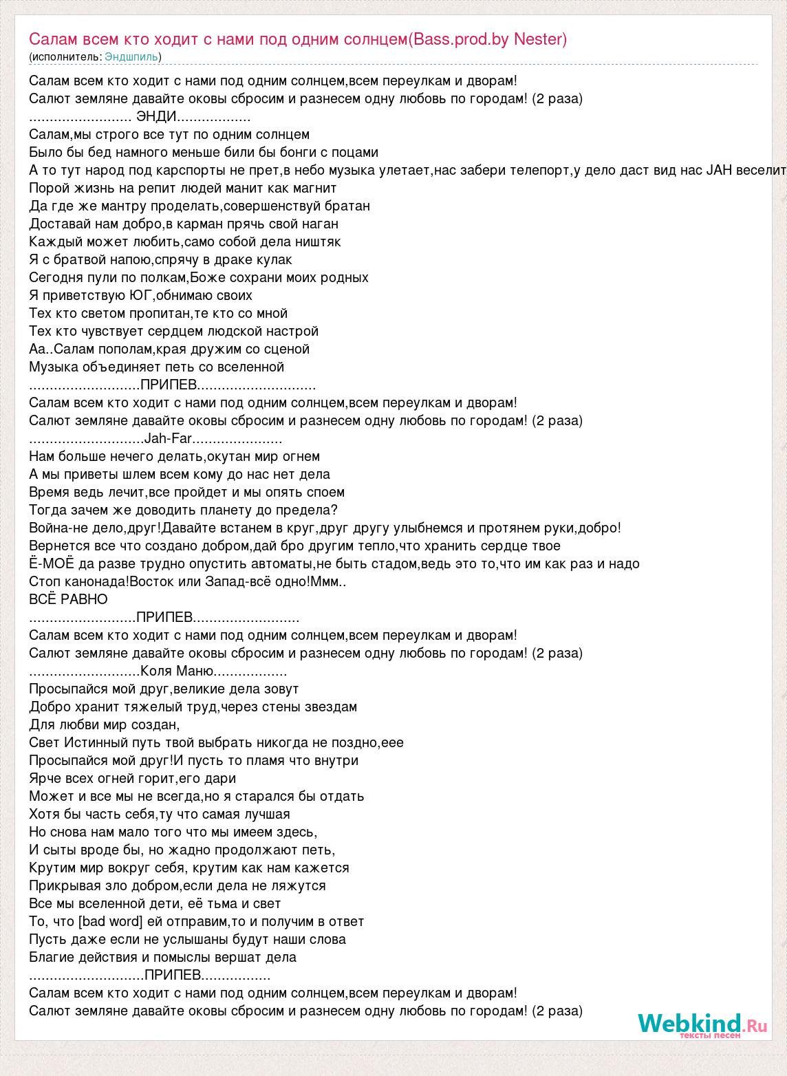 Салам всем кто ходит с нами под одним солнцем,всем переулкам и дворам! Салют земляне давайте оковы сбросим и разнесем одну любовь по городам! (2 раза) ......................... ЭНДИ.................. Салам,мы строго все тут по одним солнцем Было бы бед намного меньше били бы бонги с поцами А то тут народ под карспорты не прет,в небо музыка улетает,нас забери телепорт,у дело даст вид нас JAH веселит Порой жизнь на репит людей манит как магнит Да где же мантру проделать,совершенствуй братан Доставай нам добро,в карман прячь свой наган Каждый может любить,само собой дела ништяк Я с братвой напою,спрячу в драке кулак Сегодня пули по полкам,Боже сохрани моих родных Я приветствую ЮГ,обнимаю своих Тех кто светом пропитан,те кто со мной Тех кто чувствует сердцем людской настрой Аа..Салам пополам,края дружим со сценой Музыка объединяет петь со вселенной ...........................ПРИПЕВ............................. Салам всем кто ходит с нами под одним солнцем,всем переулкам и дворам! Салют земляне давайте оковы сбросим и разнесем одну любовь по городам! (2 раза) ............................Jah-Far...................... Нам больше нечего делать,окутан мир огнем А мы приветы шлем всем кому до нас нет дела Время ведь лечит,все пройдет и мы опять споем Тогда зачем же доводить планету до предела? Война-не дело,друг!Давайте встанем в круг,друг другу улыбнемся и протянем руки,добро! Вернется все что создано добром,дай бро другим тепло,что хранить сердце твое Ё-МОЁ да разве трудно опустить автоматы,не быть стадом,ведь это то,что им как раз и надо Стоп канонада!Восток или Запад-всё одно!Ммм.. ВСЁ РАВНО ..........................ПРИПЕВ.......................... Салам всем кто ходит с нами под одним солнцем,всем переулкам и дворам! Салют земляне давайте оковы сбросим и разнесем одну любовь по городам! (2 раза) ...........................Коля Маню.................. Просыпайся мой друг,великие дела зовут Добро хранит тяжелый труд,через стены звездам Для любви мир создан, Свет Истинный путь твой выбрать никогда не поздно,еее Просыпайся мой друг!И пусть то пламя что внутри Ярче всех огней горит,его дари Может и все мы не всегда,но я старался бы отдать Хотя бы часть себя,ту что самая лучшая Но снова нам мало того что мы имеем здесь, И сыты вроде бы, но жадно продолжают петь, Крутим мир вокруг себя, крутим как нам кажется Прикрывая зло добром,если дела не ляжутся Все мы вселенной дети, её тьма и свет То, что [bad word] ей отправим,то и получим в ответ Пусть даже если не услышаны будут наши слова Благие действия и помыслы вершат дела ............................ПРИПЕВ................. Салам всем кто ходит с нами под одним солнцем,всем переулкам и дворам! Салют земляне давайте оковы сбросим и разнесем одну любовь по городам! (2 раза)