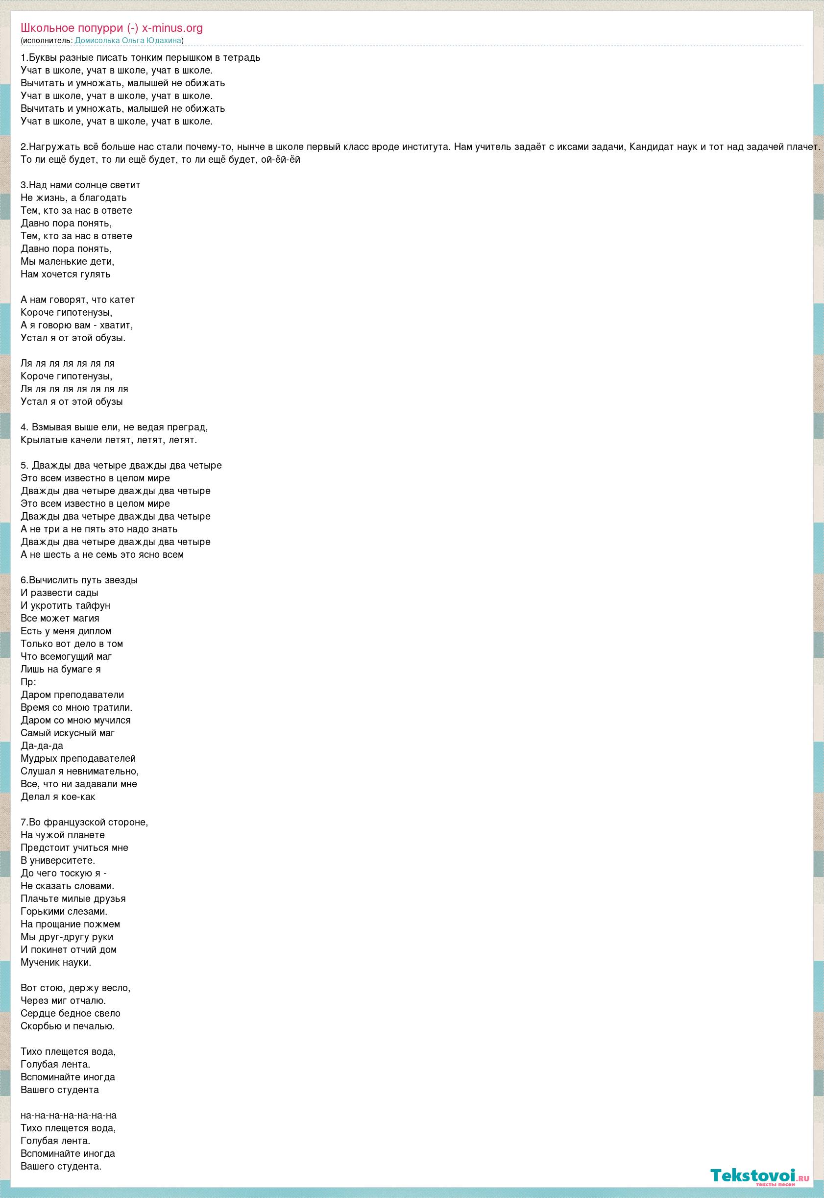 1.Буквы разные писать тонким перышком в тетрадь Учат в школе, учат в школе, учат в школе. Вычитать и умножать, малышей не обижать Учат в школе, учат в школе, учат в школе. Вычитать и умножать, малышей не обижать Учат в школе, учат в школе, учат в школе. 2.Нагружать всё больше нас стали почему-то, нынче в школе первый класс вроде института. Нам учитель задаёт с иксами задачи, Кандидат наук и тот над задачей плачет. То ли ещё будет, то ли ещё будет, то ли ещё будет, ой-ёй-ёй 3.Над нами солнце светит Не жизнь, а благодать Тем, кто за нас в ответе Давно пора понять, Тем, кто за нас в ответе Давно пора понять, Мы маленькие дети, Нам хочется гулять А нам говорят, что катет Короче гипотенузы, А я говорю вам - хватит, Устал я от этой обузы. Ля ля ля ля ля ля ля Короче гипотенузы, Ля ля ля ля ля ля ля ля Устал я от этой обузы 4. Взмывая выше ели, не ведая преград, Крылатые качели летят, летят, летят. 5. Дважды два четыре дважды два четыре Это всем известно в целом мире Дважды два четыре дважды два четыре Это всем известно в целом мире Дважды два четыре дважды два четыре А не три а не пять это надо знать Дважды два четыре дважды два четыре А не шесть а не семь это ясно всем 6.Вычислить путь звезды И развести сады И укротить тайфун Все может магия Есть у меня диплом Только вот дело в том Что всемогущий маг Лишь на бумаге я Пр: Даром преподаватели Время со мною тратили. Даром со мною мучился Самый искусный маг Да-да-да Мудрых преподавателей Слушал я невнимательно, Все, что ни задавали мне Делал я кое-как 7.Во французской стороне, На чужой планете Предстоит учиться мне В университете. До чего тоскую я - Не сказать словами. Плачьте милые друзья Горькими слезами. На прощание пожмем Мы друг-другу руки И покинет отчий дом Мученик науки. Вот стою, держу весло, Через миг отчалю. Сердце бедное свело Скорбью и печалью. Тихо плещется вода, Голубая лента. Вспоминайте иногда Вашего студента на-на-на-на-на-на-на Тихо плещется вода, Голубая лента. Вспоминайте иногда Вашего студента.
