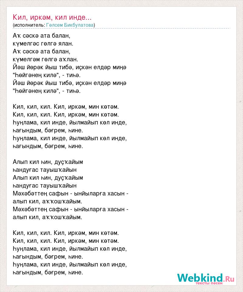 Аҡ сәскә ата балан, күмелгәс гөлгә ялан. Аҡ сәскә ата балан, күмелгәм гөлгә аҡлан. Йәш йөрәк йыш тибә, иҫкән елдәр миңә "Һөйгәнең килә", - тиһә. Йәш йөрәк йыш тибә, иҫкән елдәр миңә "Һөйгәнең килә", - тиһә. Кил, кил, кил. Кил, иркәм, мин көтәм. Кил, кил, кил. Кил, иркәм, мин көтәм. Һуңлама, кил инде, йылмайып көл инде, һағындым, бәғрем, һине. Һуңлама, кил инде, йылмайып көл инде, һағындым, бәғрем, һине. Алып кил һин, дуҫҡайым һандуғас тауышҡайын Алып кил һин, дуҫҡайым һандуғас тауышҡайын Мәхәбәттең сафын - ынйыларға хасын - алып кил, аҡҡошҡайым. Мәхәбәттең сафын - ынйыларға хасын - алып кил, аҡҡошҡайым. Кил, кил, кил. Кил, иркәм, мин көтәм. Кил, кил, кил. Кил, иркәм, мин көтәм. Һуңлама, кил инде, йылмайып көл инде, һағындым, бәғрем, һине. Һуңлама, кил инде, йылмайып көл инде, һағындым, бәғрем, һине.