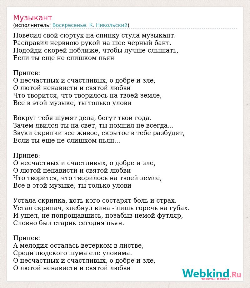 Повесил свой сюртук на спинку стула музыкант. Расправил нервною рукой на шее черный бант. Подойди скорей поближе, чтобы лучше слышать, Если ты еще не слишком пьян Припев: О несчастных и счастливых, о добре и зле, О лютой ненависти и святой любви Что творится, что творилось на твоей земле, Все в этой музыке, ты только улови Вокруг тебя шумят дела, бегут твои года. Зачем явился ты на свет, ты помнил не всегда... Звуки скрипки все живое, скрытое в тебе разбудят, Если ты еще не слишком пьян... Припев: О несчастных и счастливых, о добре и зле, О лютой ненависти и святой любви Что творится, что творилось на твоей земле, Все в этой музыке, ты только улови Устала скрипка, хоть кого состарят боль и страх. Устал скрипач, хлебнул вина - лишь горечь на губах. И ушел, не попрощавшись, позабыв немой футляр, Словно был старик сегодня пьян. Припев: А мелодия осталась ветерком в листве, Среди людского шума еле уловима. О несчастных и счастливых, о добре и зле, О лютой ненависти и святой любви
