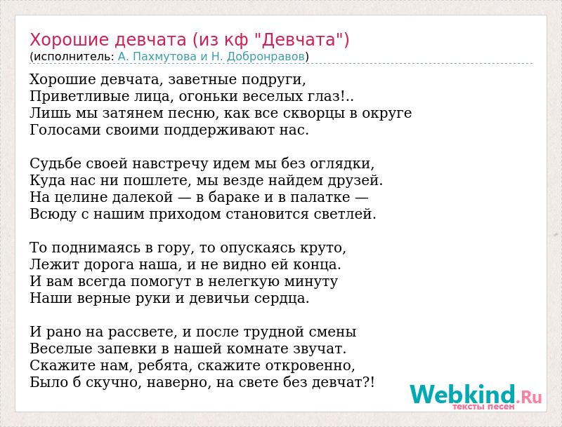 Хорошие девчата, заветные подруги, Приветливые лица, огоньки веселых глаз!.. Лишь мы затянем песню, как все скворцы в округе Голосами своими поддерживают нас. Судьбе своей навстречу идем мы без оглядки, Куда нас ни пошлете, мы везде найдем друзей. На целине далекой — в бараке и в палатке — Всюду с нашим приходом становится светлей. То поднимаясь в гору, то опускаясь круто, Лежит дорога наша, и не видно ей конца. И вам всегда помогут в нелегкую минуту Наши верные руки и девичьи сердца. И рано на рассвете, и после трудной смены Веселые запевки в нашей комнате звучат. Скажите нам, ребята, скажите откровенно, Было б скучно, наверно, на свете без девчат?!