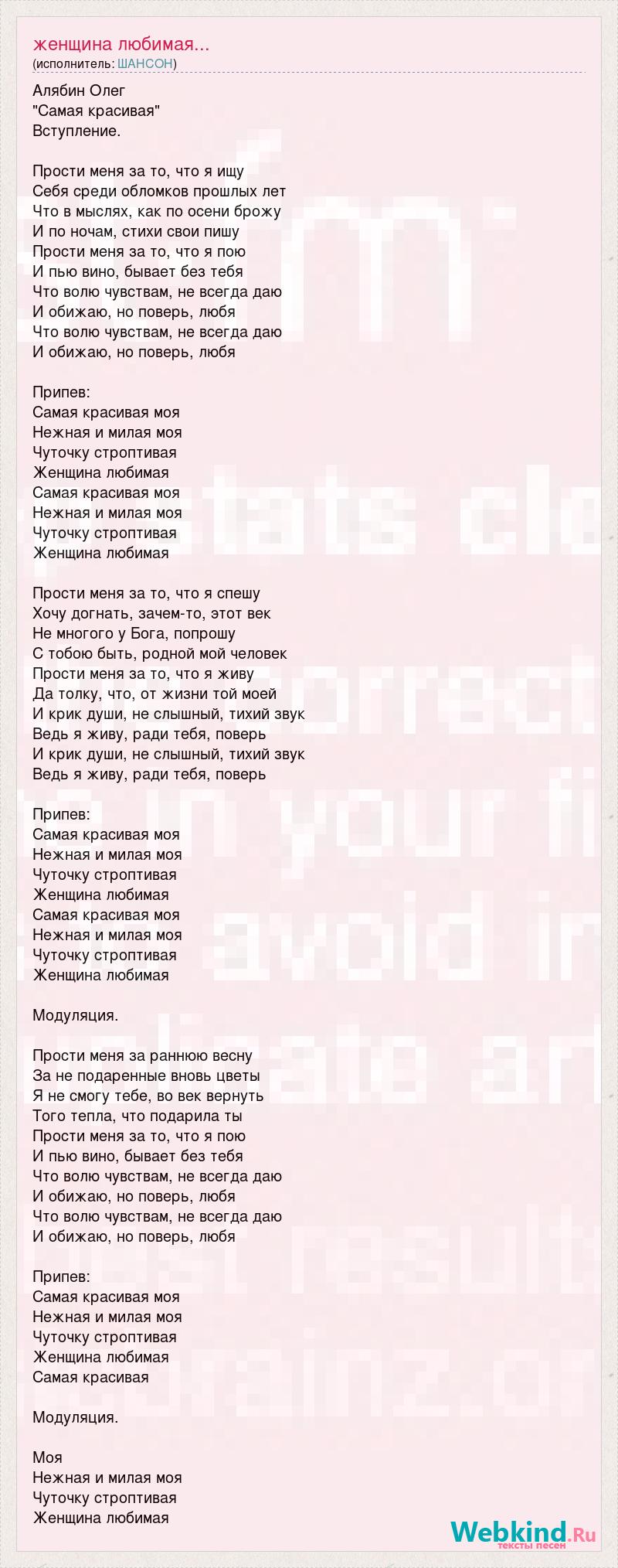Алябин Олег "Самая красивая" Вступление. Прости меня за то, что я ищу Себя среди обломков прошлых лет Что в мыслях, как по осени брожу И по ночам, стихи свои пишу Прости меня за то, что я пою И пью вино, бывает без тебя Что волю чувствам, не всегда даю И обижаю, но поверь, любя Что волю чувствам, не всегда даю И обижаю, но поверь, любя Припев: Самая красивая моя Нежная и милая моя Чуточку строптивая Женщина любимая Самая красивая моя Нежная и милая моя Чуточку строптивая Женщина любимая Прости меня за то, что я спешу Хочу догнать, зачем-то, этот век Не многого у Бога, попрошу С тобою быть, родной мой человек Прости меня за то, что я живу Да толку, что, от жизни той моей И крик души, не слышный, тихий звук Ведь я живу, ради тебя, поверь И крик души, не слышный, тихий звук Ведь я живу, ради тебя, поверь Припев: Самая красивая моя Нежная и милая моя Чуточку строптивая Женщина любимая Самая красивая моя Нежная и милая моя Чуточку строптивая Женщина любимая Модуляция. Прости меня за раннюю весну За не подаренные вновь цветы Я не смогу тебе, во век вернуть Того тепла, что подарила ты Прости меня за то, что я пою И пью вино, бывает без тебя Что волю чувствам, не всегда даю И обижаю, но поверь, любя Что волю чувствам, не всегда даю И обижаю, но поверь, любя Припев: Самая красивая моя Нежная и милая моя Чуточку строптивая Женщина любимая Самая красивая Модуляция. Моя Нежная и милая моя Чуточку строптивая Женщина любимая
