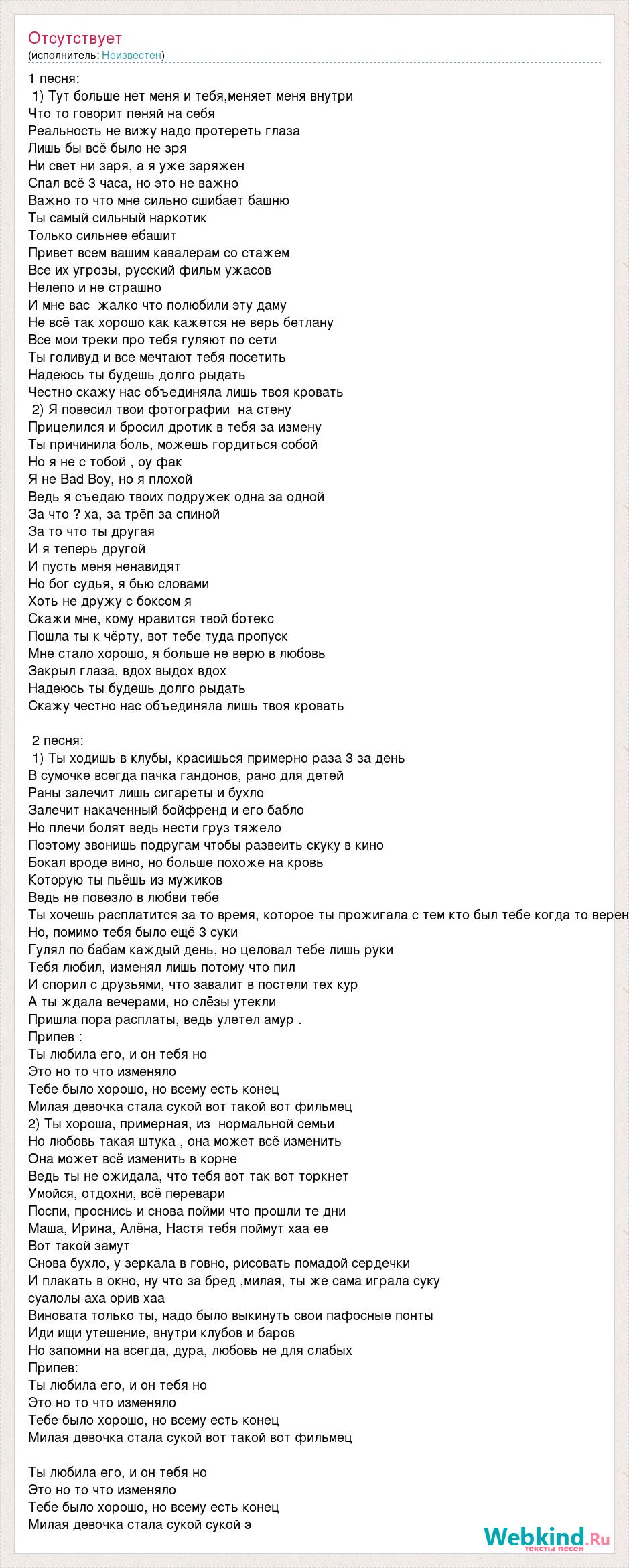 1 песня: 1) Тут больше нет меня и тебя,меняет меня внутри Что то говорит пеняй на себя Реальность не вижу надо протереть глаза Лишь бы всё было не зря Ни свет ни заря, а я уже заряжен Спал всё 3 часа, но это не важно Важно то что мне сильно сшибает башню Ты самый сильный наркотик Только сильнее ебашит Привет всем вашим кавалерам со стажем Все их угрозы, русский фильм ужасов Нелепо и не страшно И мне вас жалко что полюбили эту даму Не всё так хорошо как кажется не верь бетлану Все мои треки про тебя гуляют по сети Ты голивуд и все мечтают тебя посетить Надеюсь ты будешь долго рыдать Честно скажу нас объединяла лишь твоя кровать 2) Я повесил твои фотографии на стену Прицелился и бросил дротик в тебя за измену Ты причинила боль, можешь гордиться собой Но я не с тобой , оу фак Я не Bad Boy, но я плохой Ведь я съедаю твоих подружек одна за одной За что ? ха, за трёп за спиной За то что ты другая И я теперь другой И пусть меня ненавидят Но бог судья, я бью словами Хоть не дружу с боксом я Скажи мне, кому нравится твой ботекс Пошла ты к чёрту, вот тебе туда пропуск Мне стало хорошо, я больше не верю в любовь Закрыл глаза, вдох выдох вдох Надеюсь ты будешь долго рыдать Скажу честно нас объединяла лишь твоя кровать 2 песня: 1) Ты ходишь в клубы, красишься примерно раза 3 за день В сумочке всегда пачка гандонов, рано для детей Раны залечит лишь сигареты и бухло Залечит накаченный бойфренд и его бабло Но плечи болят ведь нести груз тяжело Поэтому звонишь подругам чтобы развеить скуку в кино Бокал вроде вино, но больше похоже на кровь Которую ты пьёшь из мужиков Ведь не повезло в любви тебе Ты хочешь расплатится за то время, которое ты прожигала с тем кто был тебе когда то верен Но, помимо тебя было ещё 3 суки Гулял по бабам каждый день, но целовал тебе лишь руки Тебя любил, изменял лишь потому что пил И спорил с друзьями, что завалит в постели тех кур А ты ждала вечерами, но слёзы утекли Пришла пора расплаты, ведь улетел амур . Припев : Ты любила его, и он тебя но Это но то что изменяло Тебе было хорошо, но всему есть конец Милая девочка стала сукой вот такой вот фильмец 2) Ты хороша, примерная, из нормальной семьи Но любовь такая штука , она может всё изменить Она может всё изменить в корне Ведь ты не ожидала, что тебя вот так вот торкнет Умойся, отдохни, всё перевари Поспи, проснись и снова пойми что прошли те дни Маша, Ирина, Алёна, Настя тебя поймут хаа ее Вот такой замут Снова бухло, у зеркала в говно, рисовать помадой сердечки И плакать в окно, ну что за бред ,милая, ты же сама играла суку суалолы аха орив хаа Виновата только ты, надо было выкинуть свои пафосные понты Иди ищи утешение, внутри клубов и баров Но запомни на всегда, дура, любовь не для слабых Припев: Ты любила его, и он тебя но Это но то что изменяло Тебе было хорошо, но всему есть конец Милая девочка стала сукой вот такой вот фильмец Ты любила его, и он тебя но Это но то что изменяло Тебе было хорошо, но всему есть конец Милая девочка стала сукой сукой э