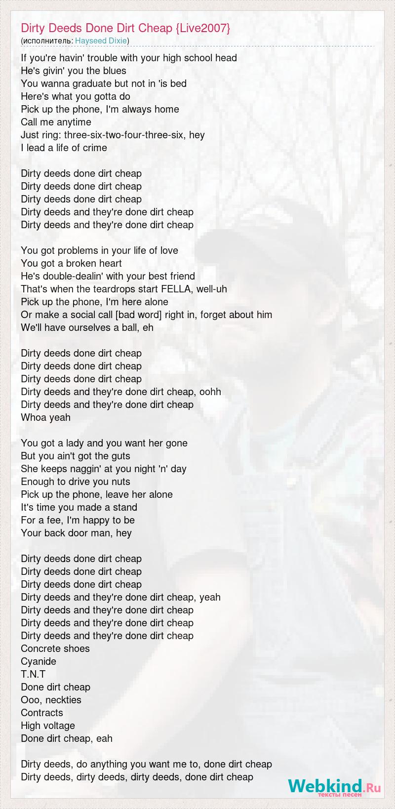 If you're havin' trouble with your high school head He's givin' you the blues You wanna graduate but not in 'is bed Here's what you gotta do Pick up the phone, I'm always home Call me anytime Just ring: three-six-two-four-three-six, hey I lead a life of crime Dirty deeds done dirt cheap Dirty deeds done dirt cheap Dirty deeds done dirt cheap Dirty deeds and they're done dirt cheap Dirty deeds and they're done dirt cheap You got problems in your life of love You got a broken heart He's double-dealin' with your best friend That's when the teardrops start FELLA, well-uh Pick up the phone, I'm here alone Or make a social call [bad word] right in, forget about him We'll have ourselves a ball, eh Dirty deeds done dirt cheap Dirty deeds done dirt cheap Dirty deeds done dirt cheap Dirty deeds and they're done dirt cheap, oohh Dirty deeds and they're done dirt cheap Whoa yeah You got a lady and you want her gone But you ain't got the guts She keeps naggin' at you night 'n' day Enough to drive you nuts Pick up the phone, leave her alone It's time you made a stand For a fee, I'm happy to be Your back door man, hey Dirty deeds done dirt cheap Dirty deeds done dirt cheap Dirty deeds done dirt cheap Dirty deeds and they're done dirt cheap, yeah Dirty deeds and they're done dirt cheap Dirty deeds and they're done dirt cheap Dirty deeds and they're done dirt cheap Concrete shoes Cyanide T.N.T Done dirt cheap Ooo, neckties Contracts High voltage Done dirt cheap, eah Dirty deeds, do anything you want me to, done dirt cheap Dirty deeds, dirty deeds, dirty deeds, done dirt cheap