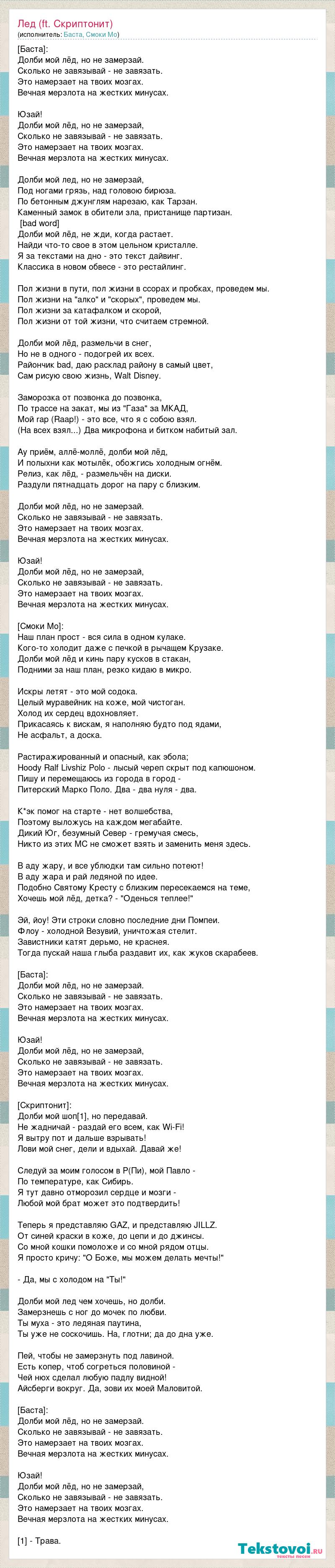 [Баста]: Долби мой лёд, но не замерзай. Сколько не завязывай - не завязать. Это намерзает на твоих мозгах. Вечная мерзлота на жестких минусах. Юзай! Долби мой лёд, но не замерзай, Сколько не завязывай - не завязать. Это намерзает на твоих мозгах. Вечная мерзлота на жестких минусах. Долби мой лед, но не замерзай, Под ногами грязь, над головою бирюза. По бетонным джунглям нарезаю, как Тарзан. Каменный замок в обители зла, пристанище партизан. [bad word] Долби мой лёд, не жди, когда растает. Найди что-то свое в этом цельном кристалле. Я за текстами на дно - это текст дайвинг. Классика в новом обвесе - это рестайлинг. Пол жизни в пути, пол жизни в ссорах и пробках, проведем мы. Пол жизни на "алко" и "скорых", проведем мы. Пол жизни за катафалком и скорой, Пол жизни от той жизни, что считаем стремной. Долби мой лёд, размельчи в снег, Но не в одного - подогрей их всех. Райончик bad, даю расклад району в самый цвет, Сам рисую свою жизнь, Walt Disney. Заморозка от позвонка до позвонка, По трассе на закат, мы из "Газа" за МКАД, Мой rap (Raap!) - это все, что я с собою взял. (На всех взял...) Два микрофона и битком набитый зал. Ау приём, аллё-моллё, долби мой лёд, И полыхни как мотылёк, обожгись холодным огнём. Релиз, как лёд, - размельчён на диски. Раздули пятнадцать дорог на пару с близким. Долби мой лёд, но не замерзай. Сколько не завязывай - не завязать. Это намерзает на твоих мозгах. Вечная мерзлота на жестких минусах. Юзай! Долби мой лёд, но не замерзай, Сколько не завязывай - не завязать. Это намерзает на твоих мозгах. Вечная мерзлота на жестких минусах. [Смоки Мо]: Наш план прост - вся сила в одном кулаке. Кого-то холодит даже с печкой в рычащем Крузаке. Долби мой лёд и кинь пару кусков в стакан, Подними за наш план, резко кидаю в микро. Искры летят - это мой содока. Целый муравейник на коже, мой чистоган. Холод их сердец вдохновляет. Прикасаясь к вискам, я наполняю будто под ядами, Не асфальт, а доска. Растиражированный и опасный, как эбола; Hoody Ralf Livshiz Polo - лысый череп скрыт под капюшоном. Пишу и перемещаюсь из города в город - Питерский Марко Поло. Два - два нуля - два. К*эк помог на старте - нет волшебства, Поэтому выложусь на каждом мегабайте. Дикий Юг, безумный Север - гремучая смесь, Никто из этих МС не сможет взять и заменить меня здесь. В аду жару, и все ублюдки там сильно потеют! В аду жара и рай ледяной по идее. Подобно Святому Кресту с близким пересекаемся на теме, Хочешь мой лёд, детка? - "Оденься теплее!" Эй, йоу! Эти строки словно последние дни Помпеи. Флоу - холодной Везувий, уничтожая стелит. Завистники катят дерьмо, не краснея. Тогда пускай наша глыба раздавит их, как жуков скарабеев. [Баста]: Долби мой лёд, но не замерзай. Сколько не завязывай - не завязать. Это намерзает на твоих мозгах. Вечная мерзлота на жестких минусах. Юзай! Долби мой лёд, но не замерзай, Сколько не завязывай - не завязать. Это намерзает на твоих мозгах. Вечная мерзлота на жестких минусах. [Скриптонит]: Долби мой шоп[1], но передавай. Не жадничай - раздай его всем, как Wi-Fi! Я вытру пот и дальше взрывать! Лови мой снег, дели и вдыхай. Давай же! Следуй за моим голосом в P(Пи), мой Павло - По температуре, как Сибирь. Я тут давно отморозил сердце и мозги - Любой мой брат может это подтвердить! Теперь я представляю GAZ, и представляю JILLZ. От синей краски в коже, до цепи и до джинсы. Со мной кошки помоложе и со мной рядом отцы. Я просто кричу: "О Боже, мы можем делать 