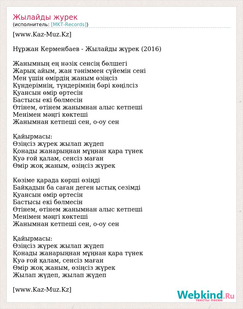 [www.Kaz-Muz.Kz] Нұржан Керменбаев - Жылайды жүрек (2016) Жанымның ең нәзік сенсің бөлшегі Жарық айым, жан тәніммен сүйемін сені Мен үшін өмірдің жаным өзіңсіз Күндерімнің, түндерімнің бәрі көңілсіз Қуансын өмір өртесін Бастысы екі бөлмесін Өтінем, өтінем жанымнан алыс кетпеші Менімен мәңгі көктеші Жанымнан кетпеші сен, о-оу сен Қайырмасы: Өзіңсіз жүрек жылап жүдеп Қонады жанарыңнан мұңнан қара түнек Куә ғой қалам, сенсіз маған Өмір жоқ жаным, өзіңсіз жүрек Көзіме қарада көрші өзіңді Байқадын ба саған деген ыстық сезімді Қуансын өмір өртесін Бастысы екі бөлмесін Өтінем, өтінем жанымнан алыс кетпеші Менімен мәңгі көктеші Жанымнан кетпеші сен, о-оу сен Қайырмасы: Өзіңсіз жүрек жылап жүдеп Қонады жанарыңнан мұңнан қара түнек Куә ғой қалам, сенсіз маған Өмір жоқ жаным, өзіңсіз жүрек Жылап жүдеп, жылап жүдеп [www.Kaz-Muz.Kz]