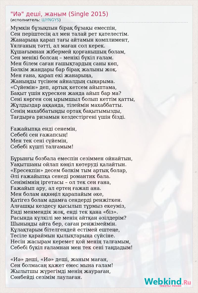 Мүмкін бұзықпын бірақ бұзақы емеспін, Сен періштесің ал мен талай рет қателестім. Жанарыңа қарап тағы айтамын комплимент, Ұялғаның тәтті, ал маған сол керек. Құшағымнан жібермей қорғанышың болам, Сен менікі болсаң – менікі бүкіл ғалам. Мен білем саған ғашықтардың саны көп, Бәлкім жандары бар бірақ жалыны жоқ. Мен ғана, қарап екі жанарыңа, Жаныңды түсінем айналдың сыңарыма. «Сүйемін» деп, артық кетсем айыптама, Бақыт үшін күрескен жанда айып бар ма? Сені көрген соң ырымшыл болып кеттім қатты, Жұлдыздар аққанда, тілеймін махаббатты. Сенің махаббатыңды ортақ бақытымызды, Тағдырға ризамын кездестіргені үшін бізді. Ғажайыпқа енді сенемін, Себебі сен ғажапсың! Мен тек сені сүйемін, Себебі күшті талғамым! Бұрынғы бозбала емеспін сезіммен ойнайтын, Уақытшаны ойлап көңіл көтеруді қалайтын. «Ересекпін» десем бәлкім тым артық болар, Әлі ғажайыпқа сенеді романтик бала. Сенімімнің іргетасы – ол тек сен ғана, Ғажайып ару, ал ертең ғажап ана. Мен болам ақкөңіл қарапайым әке, Қатігез болам адамға сендерді ренжіткен. Алғашқы кездесу қысылып тұрмыз екеуміз, Енді менмендік жоқ, енді тек қана «біз». Расында күлкілі ме менің айтқан әзілдерім? Шыныңды айта бер, саған ренжімеймін. Құлақтарым бітелгендей естімей ештеңе, Тесіле қараймын қылықтарыңа сүйсіне. Несін жасырам керемет қой менің талғамым, Себебі бүкіл ғаламнан мен тек сені таңдадым! «Иә» деші, «Иә» деші, жаным маған, Сен болмасаң қажет емес мына ғалам! Жылытшы жүрегімді менің жаураған, Сөнбейді сезімім лаулаған.