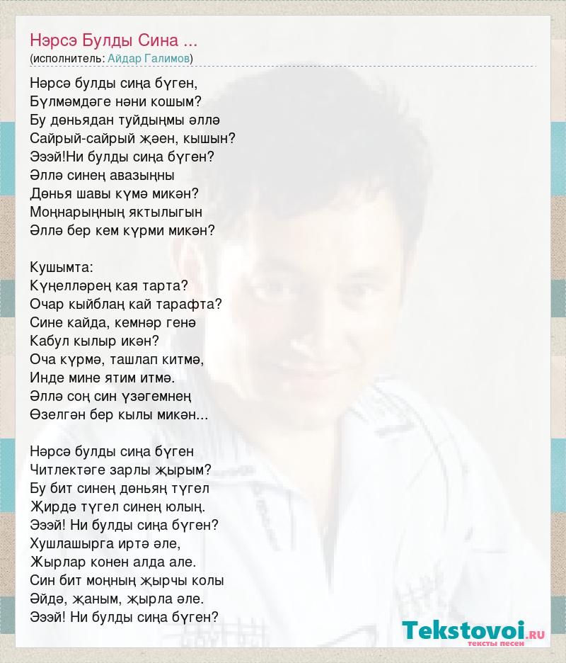 Нәрсә булды сиңа бүген, Бүлмәмдәге нәни кошым? Бу дөньядан туйдыңмы әллә Сайрый-сайрый җәен, кышын? Эээй!Ни булды сиңа бүген? Әллә синең авазыңны Дөнья шавы күмә микән? Моңнарыңның яктылыгын Әллә бер кем күрми микән? Кушымта: Күңелләрең кая тарта? Очар кыйблаң кай тарафта? Сине кайда, кемнәр генә Кабул кылыр икән? Оча күрмә, ташлап китмә, Инде мине ятим итмә. Әллә соң син үзәгемнең Өзелгән бер кылы микән... Нәрсә булды сиңа бүген Читлектәге зарлы җырым? Бу бит синең дөньяң түгел Җирдә түгел синең юлың. Эээй! Ни булды сиңа бүген? Хушлашырга иртә әле, Жырлар конен алда але. Син бит моңның җырчы колы Әйдә, җаным, җырла әле. Эээй! Ни булды сиңа бүген?