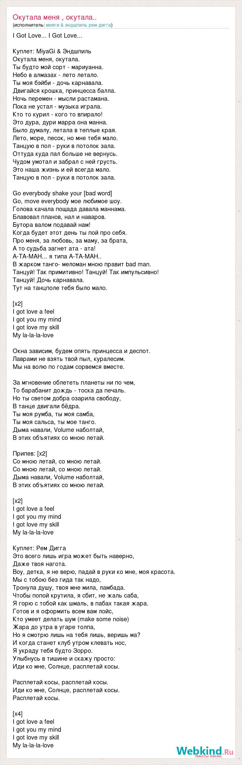 I Got Love... I Got Love... Куплет: MiyaGi & Эндшпиль Окутала меня, окутала. Ты будто мой сорт - мариуанна. Небо в алмазах - лето летало. Ты моя бэйби - дочь карнавала. Двигайся крошка, принцесса балла. Ночь перемен - мысли растамана. Пока не устал - музыка играла. Кто то курил - кого то впирало! Это дура, дури марра она манна. Было думалу, летала в теплые края. Лето, море, песок, но мне тебя мало. Танцую в пол - руки в потолок зала. Оттуда куда пал больше не вернусь. Чудом умотал и забрал с ней грусть. Это наша жизнь и ей всегда мало. Танцую в пол - руки в потолок зала. Go everybody shake your [bad word] Go, move everybody мое любимое шоу. Голова качала пощада давала маннама. Блавовал планов, нал и наваров. Бутора валом подавай нам! Когда будет этот день ты пой про себя. Про меня, за любовь, за маму, за брата, А то судьба загнет ата - ата! А-ТА-МАН... я типа А-ТА-МАН.. В жарком танго- меломан мною правит bad man. Танцуй! Так примитивно! Танцуй! Так импульсивно! Танцуй! Дочь карнавала. Тут на танцполе тебя было мало. [x2] I got love a feel I got you my mind I got love my skill My la-la-la-love Окна зависим, будем опять принцесса и деспот. Лаврами не взять твой пыл, куралесим. Мы на волю по годам сорвемся вместе. За мгновение облететь планеты ни по чем, То барабанит дождь - тоска да печаль. Но ты светом добра озарила свободу, В танце двигали бёдра. Ты моя румба, ты моя самба, Ты моя сальса, ты мое танго. Дыма навали, Volume наболтай, В этих объятиях со мною летай. Припев: [х2] Со мною летай, со мною летай. Со мною летай, со мною летай. Дыма навали, Volume наболтай, В этих объятиях со мною летай. [х2] I got love a feel I got you my mind I got love my skill My la-la-la-love Куплет: Рем Дигга Это всего лишь игра может быть наверно, Даже твоя нагота. Воу, детка, я не верю, падай в руки ко мне, моя красота. Мы с тобою без гида так надо, Тронула душу, твоя мне мила, ламбада. Чтобы попой крутила, я сбит, не жаль саба, Я горю с тобой как шмаль, в пабах такая жара. Готов и я оформить всем вам лойс, Кто умеет делать шум (make some noise) Жара до утра в угаре толпа, Но я смотрю лишь на тебя лишь, веришь ма? И когда станет клуб утром клевать нос, Я украду тебя будто Зорро. Улыбнусь в тишине и скажу просто: Иди ко мне, Солнце, расплетай косы. Расплетай косы, расплетай косы. Иди ко мне, Солнце, расплетай косы. Расплетай косы. [x4] I got love a feel I got you my mind I got love my skill My la-la-la-love