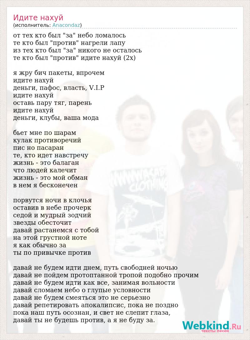 от тех кто был "за" небо ломалось те кто был "против" нагрели лапу из тех кто был "за" никого не осталось те кто был "против" идите нахуй (2х) я жру бич пакеты, впрочем идите нахуй деньги, пафос, власть, V.I.P идите нахуй оставь пару тяг, парень идите нахуй деньги, клубы, ваша мода бьет мне по шарам кулак противоречий пис но пасаран те, кто идет навстречу жизнь - это балаган что людей калечит жизнь - это мой обман в нем я бесконечен порвутся ночи в клочья оставив в небе прочерк седой и мудрый зодчий звезды обесточит давай растанемся с тобой на этой грустной ноте я как обычно за ты по привычке против давай не будем идти днем, путь свободней ночью давай не пойдем протоптанной тропой подобно прочим давай не будем идти как все, занимая вольности давай сломаем небо о глупые условности давай не будем смеяться это не серьезно давай репетировать апокалипсис, пока не поздно пока наш путь осознан, и свет не слепит глаза, давай ты не будешь против, а я не буду за.