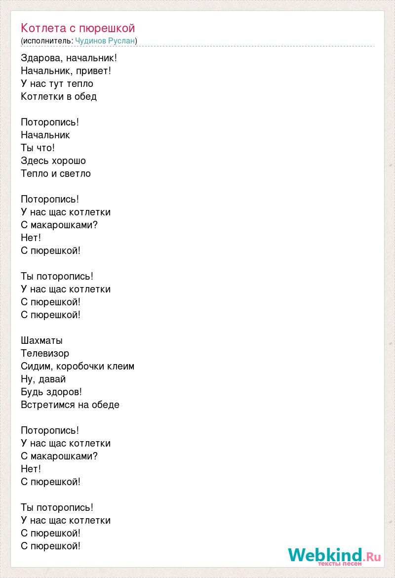 Здарова, начальник! Начальник, привет! У нас тут тепло Котлетки в обед Поторопись! Начальник Ты что! Здесь хорошо Тепло и светло Поторопись! У нас щас котлетки С макарошками? Нет! С пюрешкой! Ты поторопись! У нас щас котлетки С пюрешкой! С пюрешкой! Шахматы Телевизор Сидим, коробочки клеим Ну, давай Будь здоров! Встретимся на обеде Поторопись! У нас щас котлетки С макарошками? Нет! С пюрешкой! Ты поторопись! У нас щас котлетки С пюрешкой! С пюрешкой!