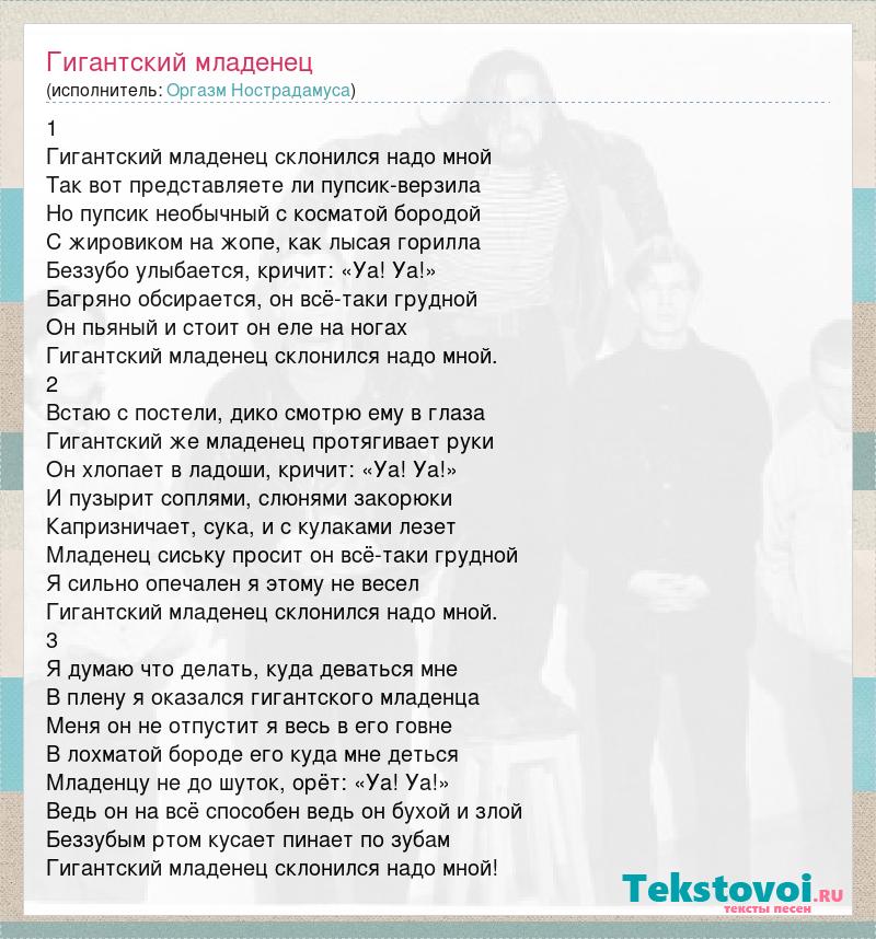 1 Гигантский младенец склонился надо мной Так вот представляете ли пупсик-верзила Но пупсик необычный с косматой бородой С жировиком на жопе, как лысая горилла Беззубо улыбается, кричит: «Уа! Уа!» Багряно обсирается, он всё-таки грудной Он пьяный и стоит он еле на ногах Гигантский младенец склонился надо мной. 2 Встаю с постели, дико смотрю ему в глаза Гигантский же младенец протягивает руки Он хлопает в ладоши, кричит: «Уа! Уа!» И пузырит соплями, слюнями закорюки Капризничает, сука, и с кулаками лезет Младенец сиську просит он всё-таки грудной Я сильно опечален я этому не весел Гигантский младенец склонился надо мной. 3 Я думаю что делать, куда деваться мне В плену я оказался гигантского младенца Меня он не отпустит я весь в его говне В лохматой бороде его куда мне деться Младенцу не до шуток, орёт: «Уа! Уа!» Ведь он на всё способен ведь он бухой и злой Беззубым ртом кусает пинает по зубам Гигантский младенец склонился надо мной!
