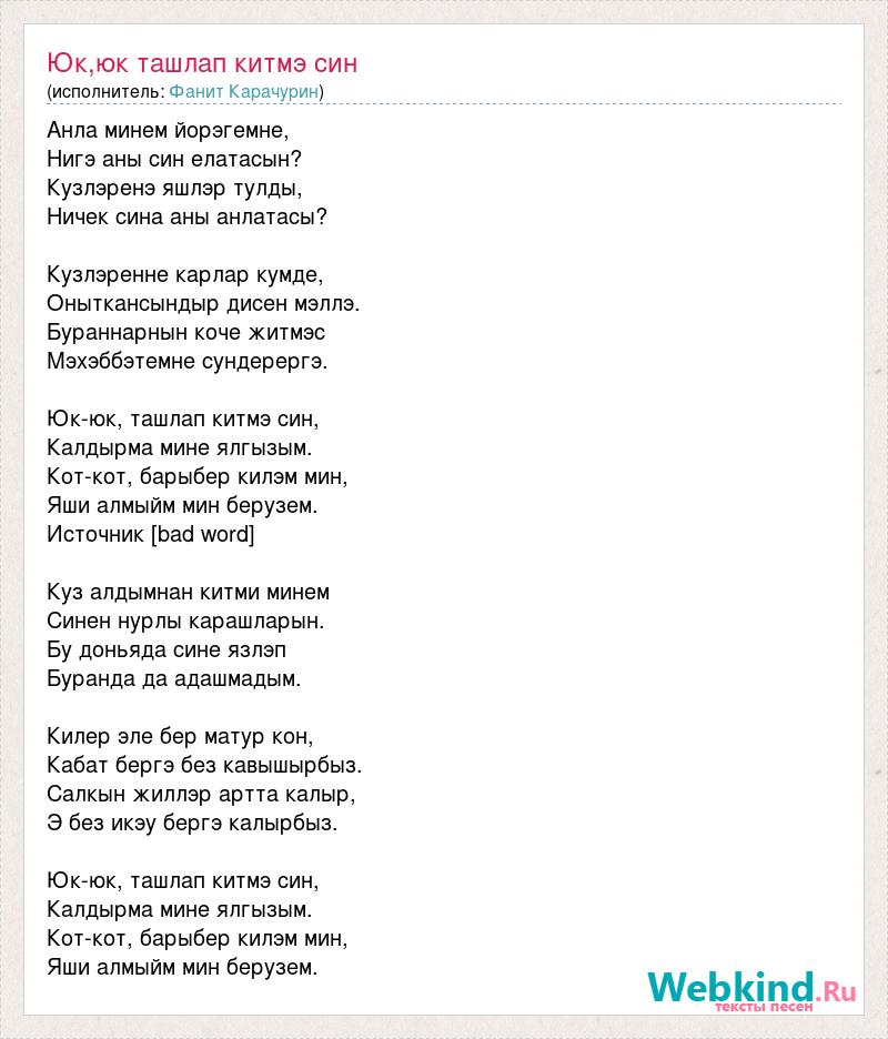 Анла минем йорэгемне, Нигэ аны син елатасын? Кузлэренэ яшлэр тулды, Ничек сина аны анлатасы? Кузлэренне карлар кумде, Оныткансындыр дисен мэллэ. Бураннарнын коче житмэс Мэхэббэтемне сундерергэ. Юк-юк, ташлап китмэ син, Калдырма мине ялгызым. Кот-кот, барыбер килэм мин, Яши алмыйм мин берузем. Источник [bad word] Куз алдымнан китми минем Синен нурлы карашларын. Бу доньяда сине язлэп Буранда да адашмадым. Килер эле бер матур кон, Кабат бергэ без кавышырбыз. Салкын жиллэр артта калыр, Э без икэу бергэ калырбыз. Юк-юк, ташлап китмэ син, Калдырма мине ялгызым. Кот-кот, барыбер килэм мин, Яши алмыйм мин берузем.