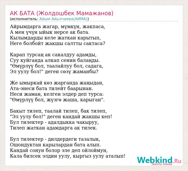 Айрымдарга жагар, мүмкүн, жакпаса, А мен үчүн ыйык нерсе ак бата. Кылымдарды келе жаткан карытып, Неге болбойт жакшы салтты сактаса? Карап турсаң ак сакалдуу адамды, Суу куйганда алкап сенин балаңды. "Өмүрлүү бол, таалайлуу бол, садага, Эл уулу бол!" деген сөзү жаманбы? Же ымыркай көз жарганда жаңыдан, Ата-энеси бата тилейт баарынан. Неси жаман, келген элдер деп турса: "Өмүрлүү бол, жүзгө жаша, карыган". Бакыт тилеп, таалай тилеп, бак тилеп, "Эл уулу бол!" деген кандай жакшы кеп! Бул тилектер - адалдыкка чакыруу, Тилеп жаткан адамдарга ак тилек. Бул тилектер - дилдердеги тазалык, Ошондуктан карылардан бата алып. Кандай сонун болор эле деп ойлоймун, Кала билсек элдин уулу, кыргыз уулу аталып!