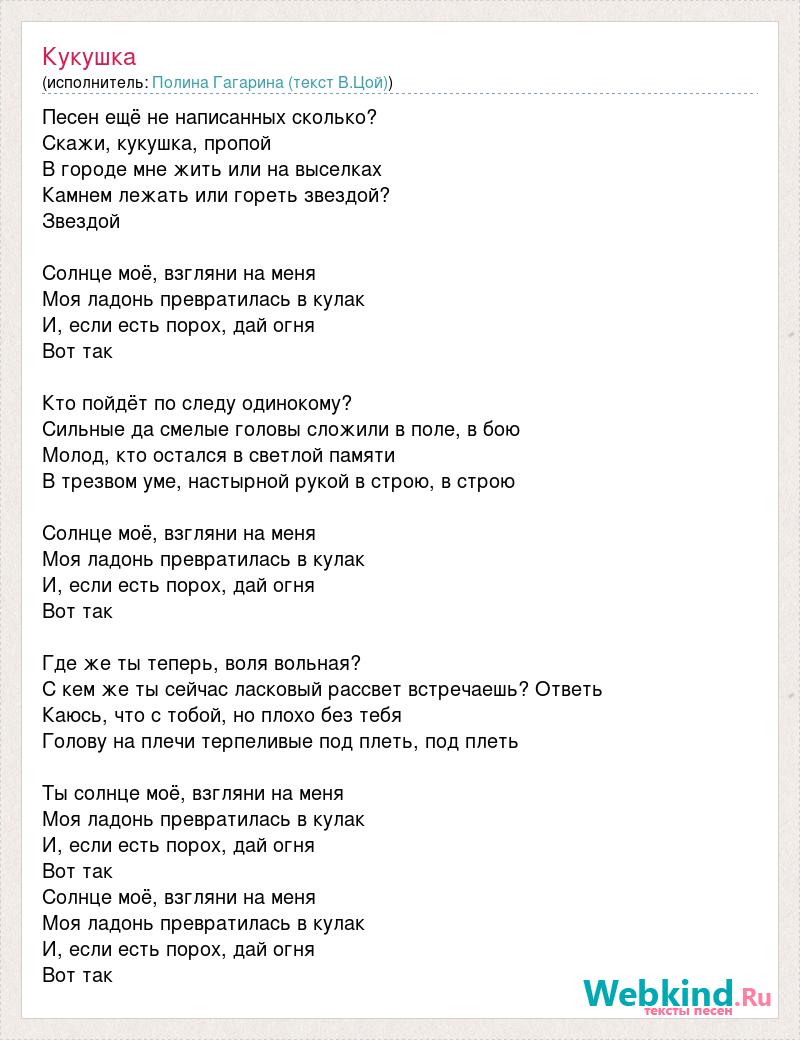 Песен ещё не написанных сколько? Скажи, кукушка, пропой В городе мне жить или на выселках Камнем лежать или гореть звездой? Звездой Солнце моё, взгляни на меня Моя ладонь превратилась в кулак И, если есть порох, дай огня Вот так Кто пойдёт по следу одинокому? Сильные да смелые головы сложили в поле, в бою Молод, кто остался в светлой памяти В трезвом уме, настырной рукой в строю, в строю Солнце моё, взгляни на меня Моя ладонь превратилась в кулак И, если есть порох, дай огня Вот так Где же ты теперь, воля вольная? С кем же ты сейчас ласковый рассвет встречаешь? Ответь Каюсь, что с тобой, но плохо без тебя Голову на плечи терпеливые под плеть, под плеть Ты солнце моё, взгляни на меня Моя ладонь превратилась в кулак И, если есть порох, дай огня Вот так Солнце моё, взгляни на меня Моя ладонь превратилась в кулак И, если есть порох, дай огня Вот так