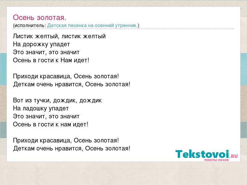 Листик желтый, листик желтый На дорожку упадет Это значит, это значит Осень в гости к Нам идет! Приходи красавица, Осень золотая! Деткам очень нравится, Осень золотая! Вот из тучки, дождик, дождик На ладошку упадет Это значит, это значит Осень в гости к нам идет! Приходи красавица, Осень золотая! Деткам очень нравится, Осень золотая!