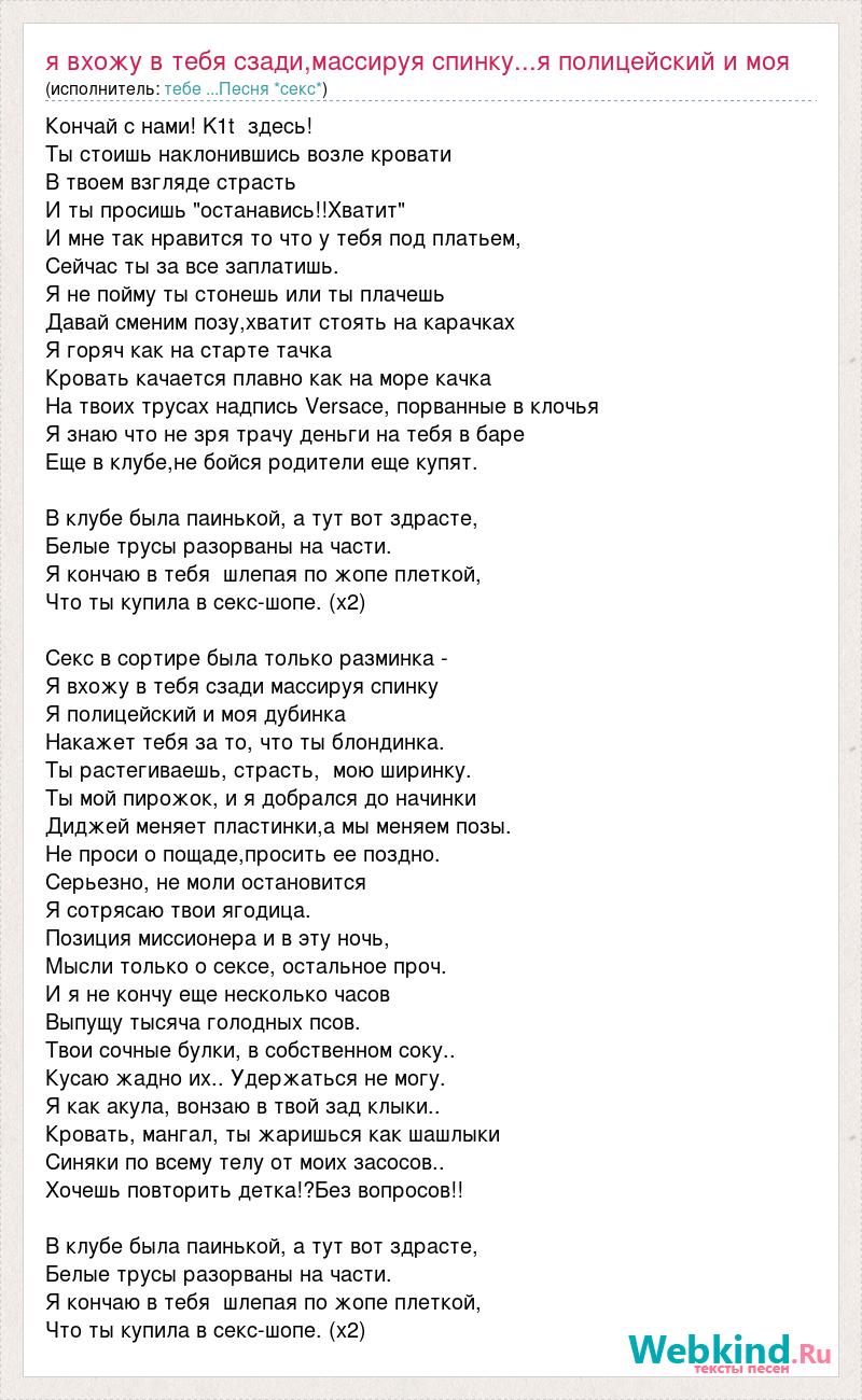 Кончай с нами! K1t здесь! Ты стоишь наклонившись возле кровати В твоем взгляде страсть И ты просишь "останавись!!Хватит" И мне так нравится то что у тебя под платьем, Сейчас ты за все заплатишь. Я не пойму ты стонешь или ты плачешь Давай сменим позу,хватит стоять на карачках Я горяч как на старте тачка Кровать качается плавно как на море качка На твоих трусах надпись Versace, порванные в клочья Я знаю что не зря трачу деньги на тебя в баре Еще в клубе,не бойся родители еще купят. В клубе была паинькой, а тут вот здрасте, Белые трусы разорваны на части. Я кончаю в тебя шлепая по жопе плеткой, Что ты купила в секс-шопе. (х2) Секс в сортире была только разминка - Я вхожу в тебя сзади массируя спинку Я полицейский и моя дубинка Накажет тебя за то, что ты блондинка. Ты растегиваешь, страсть, мою ширинку. Ты мой пирожок, и я добрался до начинки Диджей меняет пластинки,а мы меняем позы. Не проси о пощаде,просить ее поздно. Серьезно, не моли остановится Я сотрясаю твои ягодица. Позиция миссионера и в эту ночь, Мысли только о сексе, остальное проч. И я не кончу еще несколько часов Выпущу тысяча голодных псов. Твои сочные булки, в собственном соку.. Кусаю жадно их.. Удержаться не могy. Я как акула, вонзаю в твой зад клыки.. Кровать, мангал, ты жаришься как шашлыки Синяки по всему телу от моих засосов.. Хочешь повторить детка!?Без вопросов!! В клубе была паинькой, а тут вот здрасте, Белые трусы разорваны на части. Я кончаю в тебя шлепая по жопе плеткой, Что ты купила в секс-шопе. (х2)
