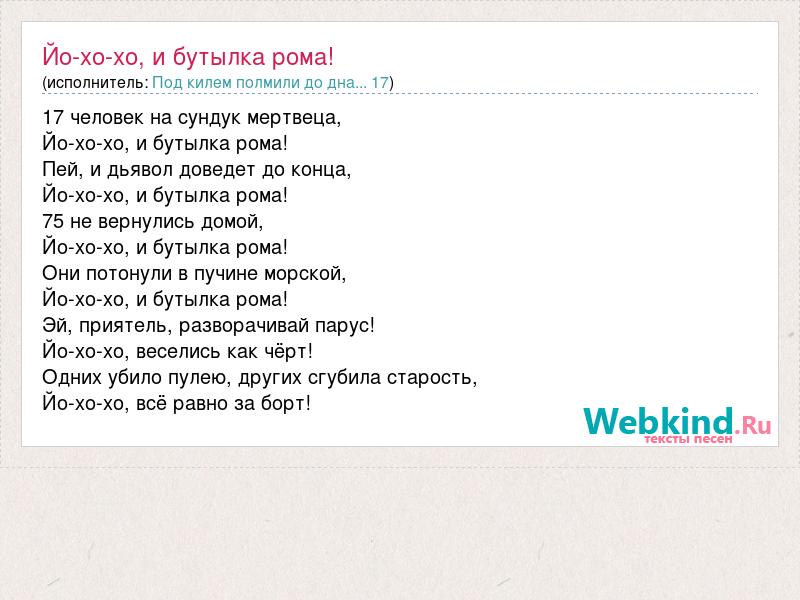 17 человек на сундук мертвеца, Йо-хо-хо, и бутылка рома! Пей, и дьявол доведет до конца, Йо-хо-хо, и бутылка рома! 75 не вернулись домой, Йо-хо-хо, и бутылка рома! Они потонули в пучине морской, Йо-хо-хо, и бутылка рома! Эй, приятель, разворачивай парус! Йо-хо-хо, веселись как чёрт! Одних убило пулею, других сгубила старость, Йо-хо-хо, всё равно за борт!
