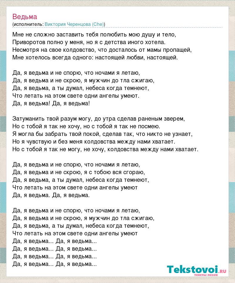 Мне не сложно заставить тебя полюбить мою душу и тело, Приворотов полно у меня, но я с детства иного хотела. Несмотря на свое колдовство, что досталось от мамы пропащей, Мне хотелось всегда одного: настоящей любви, настоящей. Да, я ведьма и не спорю, что ночами я летаю, Да, я ведьма и не скрою, я мужчин до тла сжигаю, Да, я ведьма, а ты думал, небеса когда темнеют, Что летать на этом свете одни ангелы умеют. Да, я ведьма! Да, я ведьма! Затуманить твой разум могу, до утра сделав раненым зверем, Но с тобой я так не хочу, но с тобой я так не посмею. Я могла бы забрать твой покой, сделав так, что никто не узнает, Но я чувствую и без меня колдовства между нами хватает. Но с тобой я так не могу, не хочу, колдовства между нами хватает. Да, я ведьма и не спорю, что ночами я летаю, Да, я ведьма и не скрою, я с тобою вся сгораю, Да, я ведьма, а ты думал, небеса когда темнеют, Что летать на этом свете одни ангелы умеют Да, я ведьма. Да, я ведьма. Да, я ведьма и не спорю, что ночами я летаю, Да, я ведьма и не скрою, я мужчин до тла сжигаю, Да, я ведьма, а ты думал, небеса когда темнеют, Что летать на этом свете одни ангелы умеют Да, я ведьма... Да, я ведьма... Да, я ведьма... Да, я ведьма... Да, я ведьма... Да, я ведьма... Да, я ведьма... Да, я ведьма...