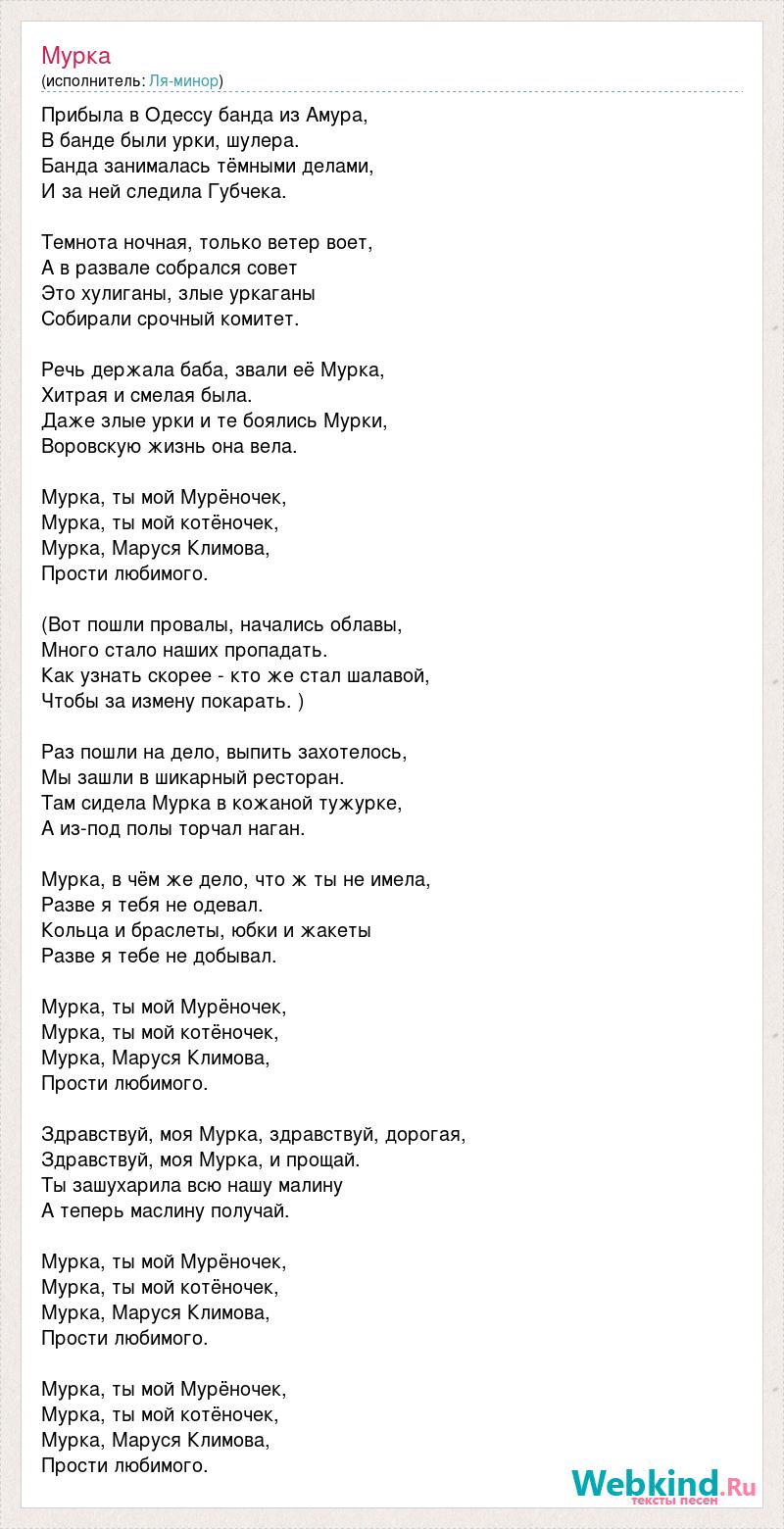 Прибыла в Одессу банда из Амура, В банде были урки, шулера. Банда занималась тёмными делами, И за ней следила Губчека. Темнота ночная, только ветер воет, А в развале собрался совет Это хулиганы, злые уркаганы Собирали срочный комитет. Речь держала баба, звали её Мурка, Хитрая и смелая была. Даже злые урки и те боялись Мурки, Воровскую жизнь она вела. Мурка, ты мой Мурёночек, Мурка, ты мой котёночек, Мурка, Маруся Климова, Прости любимого. (Вот пошли провалы, начались облавы, Много стало наших пропадать. Как узнать скорее - кто же стал шалавой, Чтобы за измену покарать. ) Раз пошли на дело, выпить захотелось, Мы зашли в шикарный ресторан. Там сидела Мурка в кожаной тужурке, А из-под полы торчал наган. Мурка, в чём же дело, что ж ты не имела, Разве я тебя не одевал. Кольца и браслеты, юбки и жакеты Разве я тебе не добывал. Мурка, ты мой Мурёночек, Мурка, ты мой котёночек, Мурка, Маруся Климова, Прости любимого. Здравствуй, моя Мурка, здравствуй, дорогая, Здравствуй, моя Мурка, и прощай. Ты зашухарила всю нашу малину А теперь маслину получай. Мурка, ты мой Мурёночек, Мурка, ты мой котёночек, Мурка, Маруся Климова, Прости любимого. Мурка, ты мой Мурёночек, Мурка, ты мой котёночек, Мурка, Маруся Климова, Прости любимого.