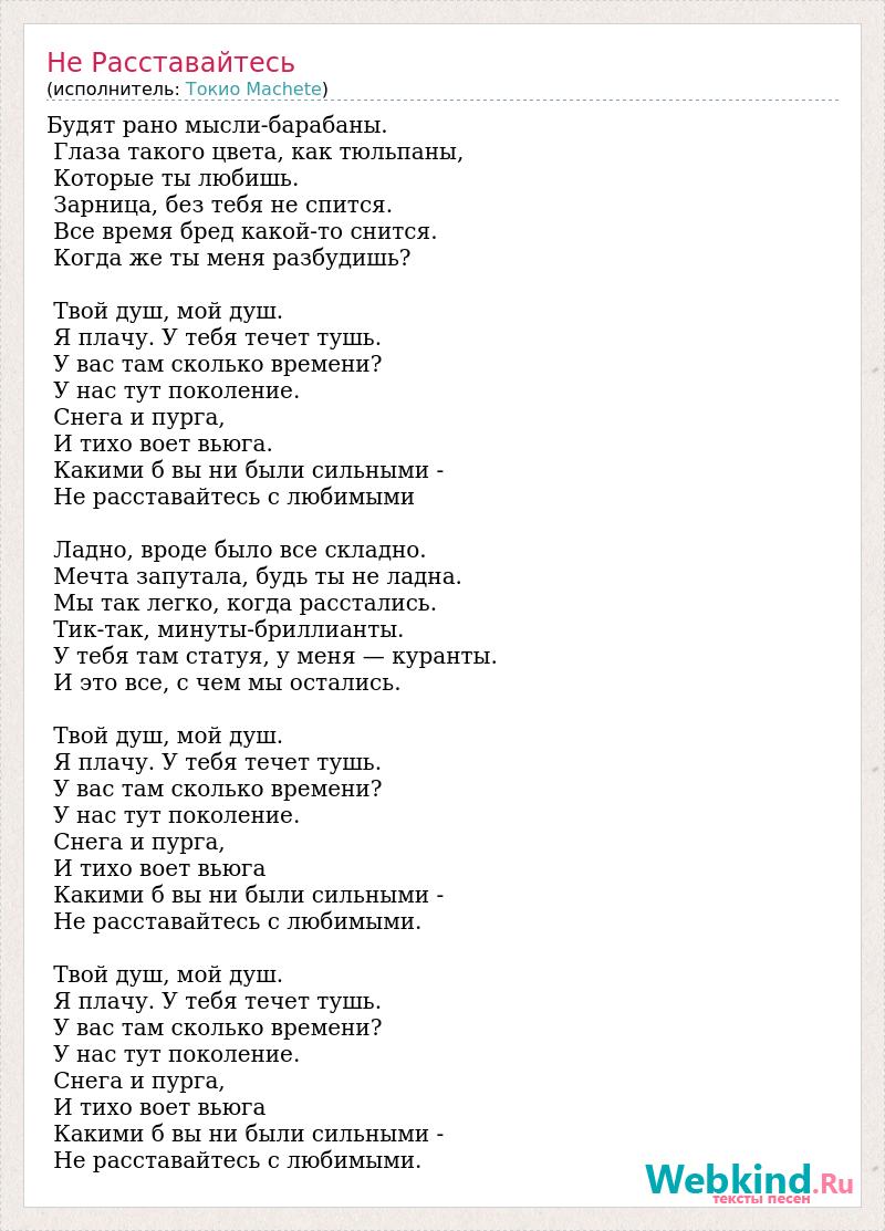 Будят рано мысли-барабаны. Глаза такого цвета, как тюльпаны, Которые ты любишь. Зарница, без тебя не спится. Все время бред какой-то снится. Когда же ты меня разбудишь? Твой душ, мой душ. Я плачу. У тебя течет тушь. У вас там сколько времени? У нас тут поколение. Снега и пурга, И тихо воет вьюга. Какими б вы ни были сильными - Не расставайтесь с любимыми Ладно, вроде было все складно. Мечта запутала, будь ты не ладна. Мы так легко, когда расстались. Тик-так, минуты-бриллианты. У тебя там статуя, у меня — куранты. И это все, с чем мы остались. Твой душ, мой душ. Я плачу. У тебя течет тушь. У вас там сколько времени? У нас тут поколение. Снега и пурга, И тихо воет вьюга Какими б вы ни были сильными - Не расставайтесь с любимыми. Твой душ, мой душ. Я плачу. У тебя течет тушь. У вас там сколько времени? У нас тут поколение. Снега и пурга, И тихо воет вьюга Какими б вы ни были сильными - Не расставайтесь с любимыми.