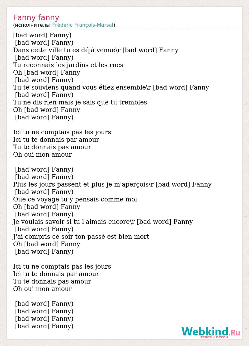 [bad word] Fanny) [bad word] Fanny) Dans cette ville tu es déjà venue\r [bad word] Fanny [bad word] Fanny) Tu reconnais les jardins et les rues Oh [bad word] Fanny [bad word] Fanny) Tu te souviens quand vous étiez ensemble\r [bad word] Fanny [bad word] Fanny) Tu ne dis rien mais je sais que tu trembles Oh [bad word] Fanny [bad word] Fanny) Ici tu ne comptais pas les jours Ici tu te donnais par amour Tu te donnais pas amour Oh oui mon amour [bad word] Fanny) [bad word] Fanny) Plus les jours passent et plus je m'aperçois\r [bad word] Fanny [bad word] Fanny) Que ce voyage tu y pensais comme moi Oh [bad word] Fanny [bad word] Fanny) Je voulais savoir si tu l'aimais encore\r [bad word] Fanny [bad word] Fanny) J'ai compris ce soir ton passé est bien mort Oh [bad word] Fanny [bad word] Fanny) Ici tu ne comptais pas les jours Ici tu te donnais par amour Tu te donnais pas amour Oh oui mon amour [bad word] Fanny) [bad word] Fanny) [bad word] Fanny) [bad word] Fanny)