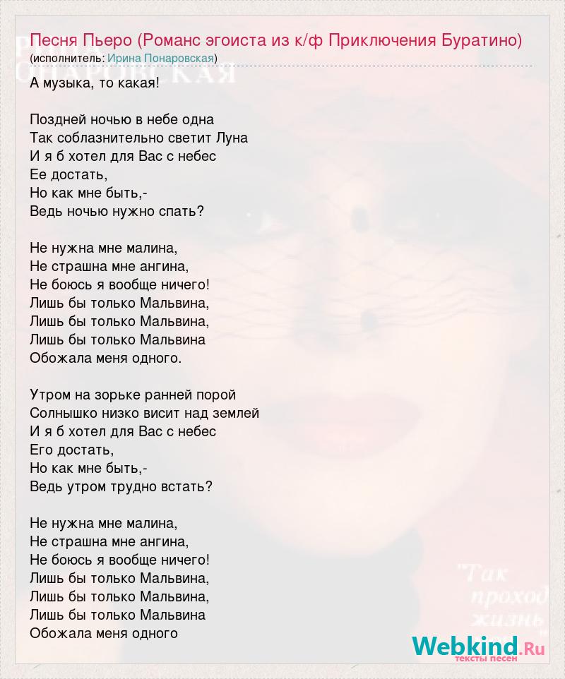 А музыка, то какая! Поздней ночью в небе одна Так соблазнительно светит Луна И я б хотел для Вас с небес Ее достать, Но как мне быть,- Ведь ночью нужно спать? Не нужна мне малина, Не страшна мне ангина, Не боюсь я вообще ничего! Лишь бы только Мальвина, Лишь бы только Мальвина, Лишь бы только Мальвина Обожала меня одного. Утром на зорьке ранней порой Солнышко низко висит над землей И я б хотел для Вас с небес Его достать, Но как мне быть,- Ведь утром трудно встать? Не нужна мне малина, Не страшна мне ангина, Не боюсь я вообще ничего! Лишь бы только Мальвина, Лишь бы только Мальвина, Лишь бы только Мальвина Обожала меня одного