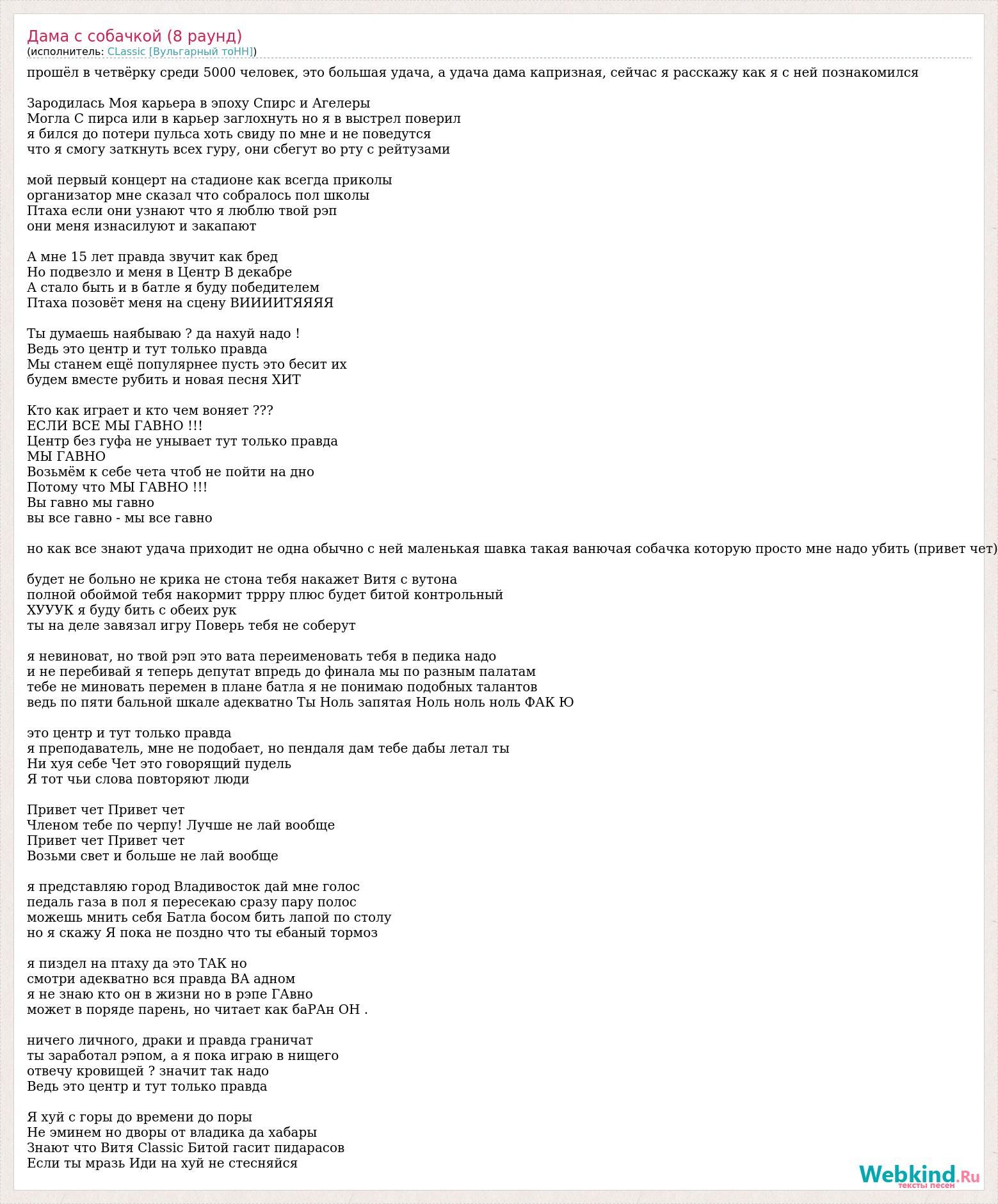 прошёл в четвёрку среди 5000 человек, это большая удача, а удача дама капризная, сейчас я расскажу как я с ней познакомился Зародилась Моя карьера в эпоху Спирс и Агелеры Могла С пирса или в карьер заглохнуть но я в выстрел поверил я бился до потери пульса хоть свиду по мне и не поведутся что я смогу заткнуть всех гуру, они сбегут во рту с рейтузами мой первый концерт на стадионе как всегда приколы организатор мне сказал что собралось пол школы Птаха если они узнают что я люблю твой рэп они меня изнасилуют и закапают А мне 15 лет правда звучит как бред Но подвезло и меня в Центр В декабре А стало быть и в батле я буду победителем Птаха позовёт меня на сцену ВИИИИТЯЯЯЯ Ты думаешь наябываю ? да нахуй надо ! Ведь это центр и тут только правда Мы станем ещё популярнее пусть это бесит их будем вместе рубить и новая песня ХИТ Кто как играет и кто чем воняет ??? ЕСЛИ ВСЕ МЫ ГАВНО !!! Центр без гуфа не унывает тут только правда МЫ ГАВНО Возьмём к себе чета чтоб не пойти на дно Потому что МЫ ГАВНО !!! Вы гавно мы гавно вы все гавно - мы все гавно но как все знают удача приходит не одна обычно с ней маленькая шавка такая ванючая собачка которую просто мне надо убить (привет чет) будет не больно не крика не стона тебя накажет Витя с вутона полной обоймой тебя накормит тррру плюс будет битой контрольный ХУУУК я буду бить с обеих рук ты на деле завязал игру Поверь тебя не соберут я невиноват, но твой рэп это вата переименовать тебя в педика надо и не перебивай я теперь депутат впредь до финала мы по разным палатам тебе не миновать перемен в плане батла я не понимаю подобных талантов ведь по пяти бальной шкале адекватно Ты Ноль запятая Ноль ноль ноль ФАК Ю это центр и тут только правда я преподаватель, мне не подобает, но пендаля дам тебе дабы летал ты Ни хуя себе Чет это говорящий пудель Я тот чьи слова повторяют люди Привет чет Привет чет Членом тебе по черпу! Лучше не лай вообще Привет чет Привет чет Возьми свет и больше не лай вообще я представляю город Владивосток дай мне голос педаль газа в пол я пересекаю сразу пару полос можешь мнить себя Батла босом бить лапой по столу но я скажу Я пока не поздно что ты ебаный тормоз я пиздел на птаху да это ТАК но смотри адекватно вся правда ВА адном я не знаю кто он в жизни но в рэпе ГАвно может в поряде парень, но читает как баРАн ОН . ничего личного, драки и правда граничат ты заработал рэпом, а я пока играю в нищего отвечу кровищей ? значит так надо Ведь это центр и тут только правда Я хуй с горы до времени до поры Не эминем но дворы от владика да хабары Знают что Витя Classic Битой гасит пидарасов Если ты мразь Иди на хуй не стесняйся
