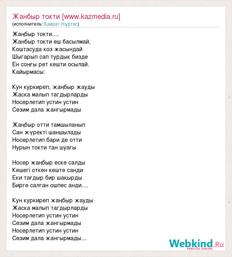 Жаңбыр токти.... Жанбыр токти еш басылмай, Коштасуда коз жасындай Шыгарып сап турдык бизде Ен соңғы рет кешти осылай. Кайырмасы: Кун куркиреп, жаңбыр жауды Жаска малып тагдырларды Носерлетип устин устин Сезим дала жангырмады Жаңбыр отти тамшыланып Сан жүректі шаншылады Носерлетип бари де отти Нурын токти тан шуагы Носер жаңбыр еске салды Кешегі откен кеште санди Еки тағдыр бир шақырды Бирге салган ошпес анди.... Кун куркиреп жаңбыр жауды Жаска малып тагдырларды Носерлетип устин устин Сезим дала жангырмады Носерлетип устин устин Сезим дала жангырмады...