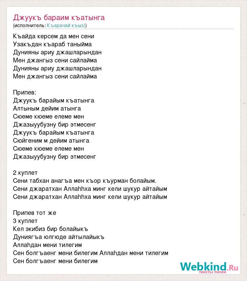 Къайда керсем да мен сени Узакъдан къараб таныйма Дунияны ариу джашларындан Мен джангыз сени сайлайма Дунияны ариу джашларындан Мен джангыз сени сайлайма Припев: Джуукъ барайым къатынга Алтыным дейим атынга Сюеме кюеме елеме мен Джазыуубузну бир этмесенг Джуукъ барайым къатынга Сюйгеним м дейим атынга Сюеме кюеме елеме мен Джазыуубузну бир этмесенг 2 куплет Сени табхан анагъа мен къор къурман болайым. Сени джаратхан Аллаhhха минг кели шукур айтайым Cени джаратхан Аллаhhха минг кели шукур айтайым Припев тот же 3 куплет Кел экибиз бир болайыкъ Дуниягъа юлгюде айтылайыкъ Аллаhдан мени тилегим Сен болгъаенг мени билегим Аллаhдан мени тилегим Сен болгъаенг мени билегим