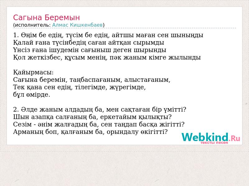 1. Өңім бе едің, түсім бе едің, айтшы маған сен шыныңды Қалай ғана түсінбедің саған айтқан сырымды Үнсіз ғана ішудемін сағыныш деген шырынды Қол жеткізбес, құсым менің, пәк жаным кімге жылынды Қайырмасы: Сағына беремін, таңбаспағаным, алыстағаным, Тек қана сен едің, тілегімде, жүрегімде, бұл өмірде. 2. Әлде жаным алдадың ба, мен сақтаған бір үмітті? Шын азапқа салғаның ба, еркетайым қылықты? Сезім - әнім жалғадың ба, сен таңдап басқа жігітті? Арманың боп, қалғаным ба, орындалу өкігітті?