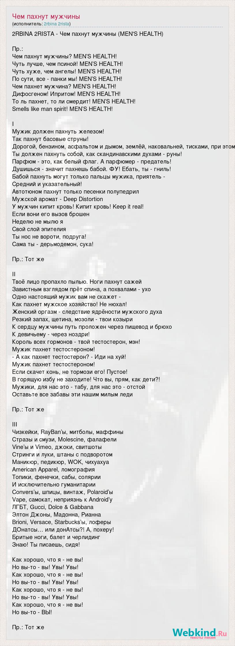 2RBINA 2RISTA - Чем пахнут мужчины (MEN'S HEALTH) Пр.: Чем пахнут мужчины? MEN’S HEALTH! Чуть лучше, чем псиной! MEN’S HEALTH! Чуть хуже, чем ангелы! MEN’S HEALTH! По сути, все - панки мы! MEN’S HEALTH! Чем пахнет мужчина? MEN’S HEALTH! Дифосгеном! Ипритом! MEN’S HEALTH! То ль пахнет, то ли смердит! MEN’S HEALTH! Smells like man spirit! MEN’S HEALTH! I Мужик должен пахнуть железом! Так пахнут басовые струны! Дорогой, бензином, асфальтом и дымом, землёй, наковальней, тисками, при этом Ты должен пахнуть собой, как скандинавскими духами - руны! Парфюм - это, как белый флаг. А парфюмер - предатель! Душишься - значит пахнешь бабой. ФУ! Ебать, ты - гниль! Бабой пахнуть могут только пальцы мужика, приятель - Средний и указательный! Автотюном пахнут только песенки полупедрил Мужской аромат - Deep Distortion У мужчин кипит кровь! Кипит кровь! Keep it real! Если вони его вызов брошен Неделю не мылю я Свой слой эпителия Ты нос не вороти, подруга! Сама ты - дерьмодемон, сука! Пр.: Тот же II Твоё лицо пропахло пылью. Ноги пахнут сажей Завистным взглядом прёт спина, а похвалами - ухо Одно настоящий мужик вам не скажет - Как пахнет мужское хозяйство! Не нюхал! Женский оргазм - следствие ядрёности мужского духа Резкий запах, щетина, мозоли - твои козыри К сердцу мужчины путь проложен через пищевод и брюхо К девичьему - через ноздри! Король всех гормонов - твой тестостерон, мэн! Мужик пахнет тестостероном! - А как пахнет тестостерон? - Иди на хуй! Мужик пахнет тестостероном! Если скачет конь, не тормози его! Пустое! В горящую избу не заходите! Что вы, прям, как дети?! Мужики, для нас это - табу, для нас это - отстой Оставьте все забавы эти нашим милым леди Пр.: Тот же III Чизкейки, RayBan’ы, митболы, маффины Стразы и смузи, Molescine, фалафели Vine’ы и Vimeo, джоки, свитшоты Стринги и луки, штаны с подворотом Маникюр, педикюр, WOK, чихуахуа American Apparel, ломография Топики, фенечки, сабы, солярии И исключительно гуманитарии Convers’ы, шпицы, винтаж, Polaroid’ы Vape, самокат, неприязнь к Android’у ЛГБТ, Gucci, Dolce & Gabbana Элтон Джоны, Мадонна, Рианна Brioni, Versace, Starbucks’ы, лоферы ДОнатсы… или донАтсы?! А, похеру! Бритые ноги, балет и черлидинг Знаю! Ты писаешь, сидя! Как хорошо, что я - не вы! Но вы-то - вы! Увы! Увы! Как хорошо, что я - не вы! Но вы-то - вы! Увы! Увы! Как хорошо, что я - не вы! Но вы-то - вы! Увы! Увы! Как хорошо, что я - не вы! Но вы-то - ВЫ! Пр.: Тот же