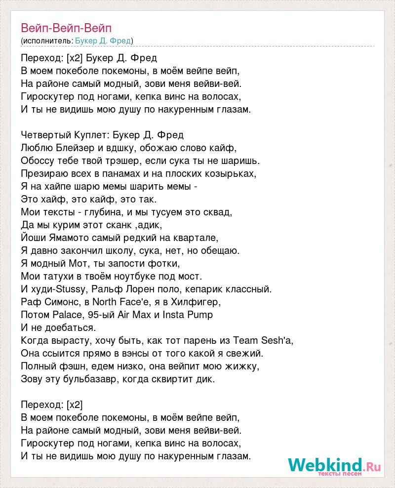 Переход: [х2] Букер Д. Фред В моем покеболе покемоны, в моём вейпе вейп, На районе самый модный, зови меня вейви-вей. Гироскутер под ногами, кепка винс на волосах, И ты не видишь мою душу по накуренным глазам. Четвертый Куплет: Букер Д. Фред Люблю Блейзер и вдшку, обожаю слово кайф, Обоссу тебе твой трэшер, если сука ты не шаришь. Презираю всех в панамах и на плоских козырьках, Я на хайпе шарю мемы шарить мемы - Это хайф, это кайф, это так. Мои тексты - глубина, и мы тусуем это сквад, Да мы курим этот сканк ,адик, Йоши Ямамото самый редкий на квартале, Я давно закончил школу, сука, нет, но обещаю. Я модный Мот, ты запости фотки, Мои татухи в твоём ноутбуке под мост. И худи-Stussy, Ральф Лорен поло, кепарик классный. Раф Симонс, в North Face'е, я в Хилфигер, Потом Palace, 95-ый Air Max и Insta Pump И не доебаться. Когда вырасту, хочу быть, как тот парень из Team Sesh'а, Она ссыится прямо в вэнсы от того какой я свежий. Полный фэшн, едем низко, она вейпит мою жижку, Зову эту бульбазавр, когда сквиртит дик. Переход: [х2] В моем покеболе покемоны, в моём вейпе вейп, На районе самый модный, зови меня вейви-вей. Гироскутер под ногами, кепка винс на волосах, И ты не видишь мою душу по накуренным глазам.