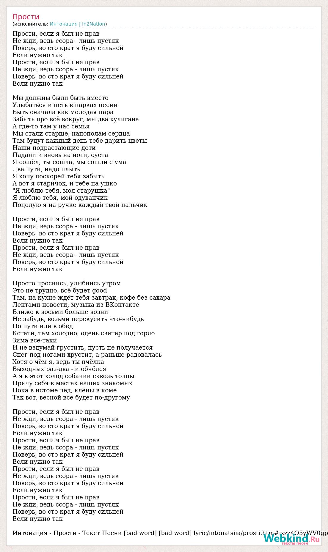 Прости, если я был не прав Не жди, ведь ссора - лишь пустяк Поверь, во сто крат я буду сильней Если нужно так Прости, если я был не прав Не жди, ведь ссора - лишь пустяк Поверь, во сто крат я буду сильней Если нужно так Мы должны были быть вместе Улыбаться и петь в парках песни Быть сначала как молодая пара Забыть про всё вокруг, мы два хулигана А где-то там у нас семья Мы стали старше, напополам сердца Там будут каждый день тебе дарить цветы Наши подрастающие дети Падали и вновь на ноги, суета Я сошёл, ты сошла, мы сошли с ума Два пути, надо плыть Я хочу поскорей тебя забыть А вот я старичок, и тебе на ушко "Я люблю тебя, моя старушка" Я люблю тебя, мой одуванчик Поцелую я на ручке каждый твой пальчик Прости, если я был не прав Не жди, ведь ссора - лишь пустяк Поверь, во сто крат я буду сильней Если нужно так Прости, если я был не прав Не жди, ведь ссора - лишь пустяк Поверь, во сто крат я буду сильней Если нужно так Просто проснись, улыбнись утром Это не трудно, всё будет good Там, на кухне ждёт тебя завтрак, кофе без сахара Лентами новости, музыка из ВКонтакте Ближе к восьми больше возни Не забудь, возьми перекусить что-нибудь По пути или в обед Кстати, там холодно, одень свитер под горло Зима всё-таки И не вздумай грустить, пусть не получается Снег под ногами хрустит, а раньше радовалась Хотя о чём я, ведь ты пчёлка Выходных раз-два - и обчёлся А я в этот холод собачий сквозь толпы Прячу себя в местах наших знакомых Пока в истоме лёд, клёны в коме Так вот, весной всё будет по-другому Прости, если я был не прав Не жди, ведь ссора - лишь пустяк Поверь, во сто крат я буду сильней Если нужно так Прости, если я был не прав Не жди, ведь ссора - лишь пустяк Поверь, во сто крат я буду сильней Если нужно так Прости, если я был не прав Не жди, ведь ссора - лишь пустяк Поверь, во сто крат я буду сильней Если нужно так Прости, если я был не прав Не жди, ведь ссора - лишь пустяк Поверь, во сто крат я буду сильней Если нужно так Интонация - Прости - Текст Песни [bad word] [bad word] lyric/intonatsiia/prosti.htm#ixzz4O5yWV0gp