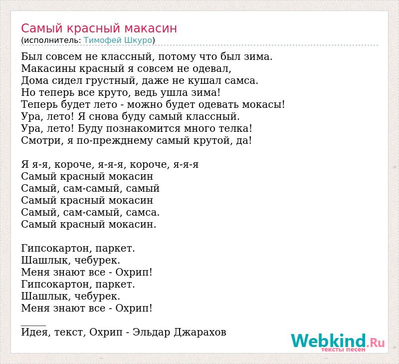 Был совсем не классный, потому что был зима. Макасины красный я совсем не одевал, Дома сидел грустный, даже не кушал самса. Но теперь все круто, ведь ушла зима! Теперь будет лето - можно будет одевать мокасы! Ура, лето! Я снова буду самый классный. Ура, лето! Буду познакомится много телка! Смотри, я по-прежднему самый крутой, да! Я я-я, короче, я-я-я, короче, я-я-я Самый красный мокасин Самый, сам-самый, самый Самый красный мокасин Самый, сам-самый, самса. Самый красный мокасин. Гипсокартон, паркет. Шашлык, чебурек. Меня знают все - Охрип! Гипсокартон, паркет. Шашлык, чебурек. Меня знают все - Охрип! _____ Идея, текст, Охрип - Эльдар Джарахов
