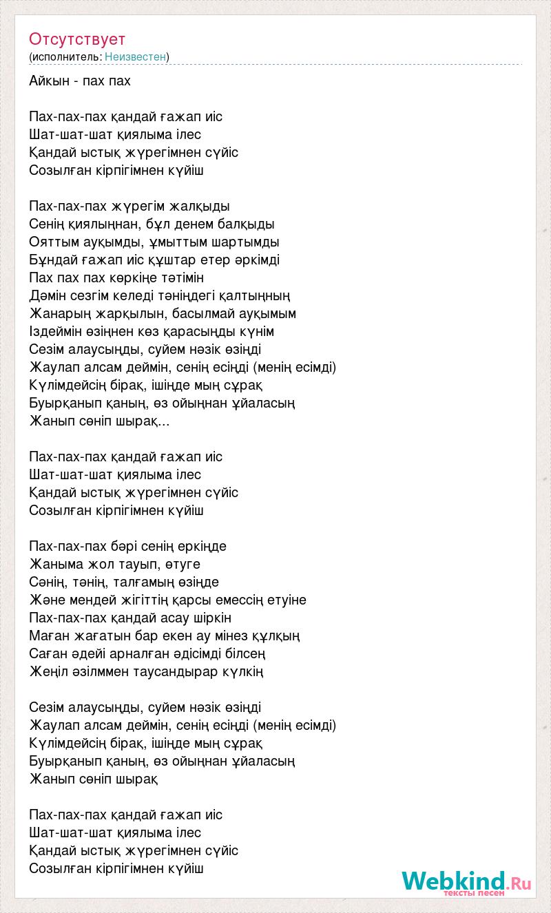 Айкын - пах пах Пах-пах-пах қандай ғажап иіс Шат-шат-шат қиялыма ілес Қандай ыстық жүрегімнен сүйіс Созылған кірпігімнен күйіш Пах-пах-пах жүрегім жалқыды Сенің қиялыңнан, бұл денем балқыды Ояттым ауқымды, ұмыттым шартымды Бұндай ғажап иіс құштар етер әркімді Пах пах пах көркіңе тәтімін Дәмін сезгім келеді тәніңдегі қалтыңның Жанарың жарқылын, басылмай ауқымым Іздеймін өзіңнен көз қарасыңды күнім Сезім алаусыңды, суйем нәзік өзіңді Жаулап алсам деймін, сенің есіңді (менің есімді) Күлімдейсің бірақ, ішіңде мың сұрақ Буырқанып қаның, өз ойыңнан ұйаласың Жанып сөніп шырақ... Пах-пах-пах қандай ғажап иіс Шат-шат-шат қиялыма ілес Қандай ыстық жүрегімнен сүйіс Созылған кірпігімнен күйіш Пах-пах-пах бәрі сенің еркіңде Жаныма жол тауып, өтуге Сәнің, тәнің, талғамың өзіңде Және мендей жігіттің қарсы емессің етуіне Пах-пах-пах қандай асау шіркін Маған жағатын бар екен ау мінез құлқың Саған әдейі арналған әдісімді білсең Жеңіл әзілммен таусандырар күлкің Сезім алаусыңды, суйем нәзік өзіңді Жаулап алсам деймін, сенің есіңді (менің есімді) Күлімдейсің бірақ, ішіңде мың сұрақ Буырқанып қаның, өз ойыңнан ұйаласың Жанып сөніп шырақ Пах-пах-пах қандай ғажап иіс Шат-шат-шат қиялыма ілес Қандай ыстық жүрегімнен сүйіс Созылған кірпігімнен күйіш