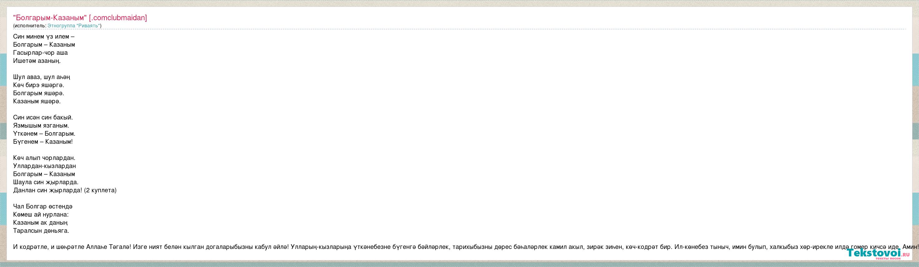 Син минем үз илем – Болгарым – Казаным Гасырлар-чор аша Ишетәм азаның. Шул аваз, шул аһәң Көч бирэ яшәргә. Болгарым яшәрә. Казаным яшәрә. Син исән син бакый. Язмышым язганым. Үткәнем – Болгарым. Бүгенем – Казаным! Көч алып чорлардан. Уллардан-кызлардан Болгарым – Казаным Шаула син җырларда. Данлан син җырларда! (2 куплета) Чал Болгар өстендә Көмеш ай нурлана: Казаным ак даның Таралсын дөньяга. И кодрәтле, и шөһрәтле Аллаһе Тәгалә! Изге ният белән кылган догаларыбызны кабул әйлә! Улларың-кызларыңа үткәнебезне бүгенгә бәйләрлек, тарихыбызны дөрес бәһаләрлек камил акыл, зирәк зиһен, көч-кодрәт бир. Ил-көнебез тыныч, имин булып, халкыбыз хөр-ирекле илдә гомер кичсә иде. Амин!