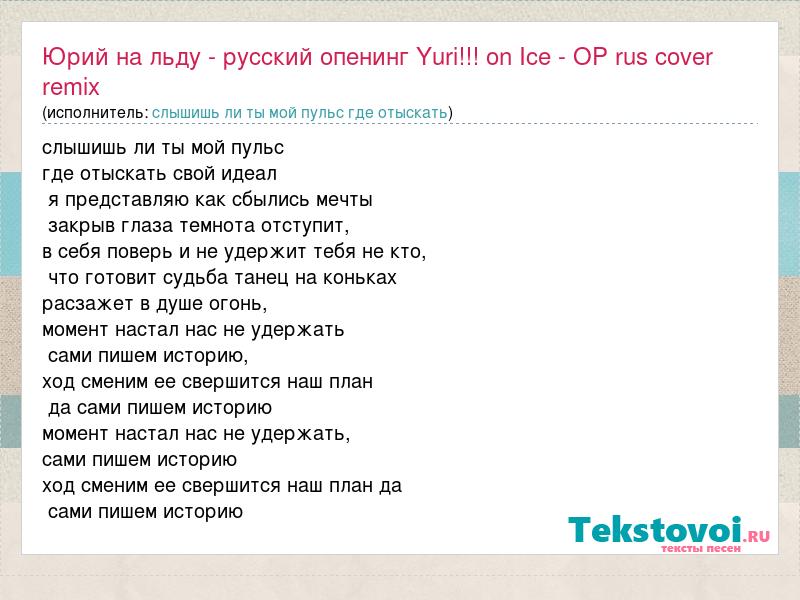 слышишь ли ты мой пульс где отыскать свой идеал я представляю как сбылись мечты закрыв глаза темнота отступит, в себя поверь и не удержит тебя не кто, что готовит судьба танец на коньках расзажет в душе огонь, момент настал нас не удержать сами пишем историю, ход сменим ее свершится наш план да сами пишем историю момент настал нас не удержать, сами пишем историю ход сменим ее свершится наш план да сами пишем историю