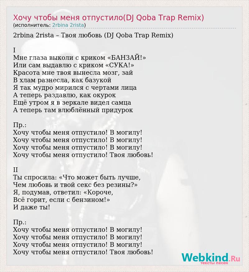 2rbina 2rista – Твоя любовь (DJ Qoba Trap Remix) I Мне глаза выколи с криком «БАНЗАЙ!» Или сам выдавлю с криком «СУКА!» Красота мне твоя вынесла мозг, зай В хлам разнесла, как базукой Я так мудро мирился с чертами лица А теперь раздавлю, как окурок Ещё утром я в зеркале видел самца А теперь там влюблённый придурок Пр.: Хочу чтобы меня отпустило! В могилу! Хочу чтобы меня отпустило! В могилу! Хочу чтобы меня отпустило! В могилу! Хочу чтобы меня отпустило! Твоя любовь! II Ты спросила: «Что может быть лучше, Чем любовь и твой секс без резины?» Я, подумав, ответил: «Короче, Всё горит, если с бензином!» И даже ты! Пр.: Хочу чтобы меня отпустило! В могилу! Хочу чтобы меня отпустило! В могилу! Хочу чтобы меня отпустило! В могилу! Хочу чтобы меня отпустило! Твоя любовь!