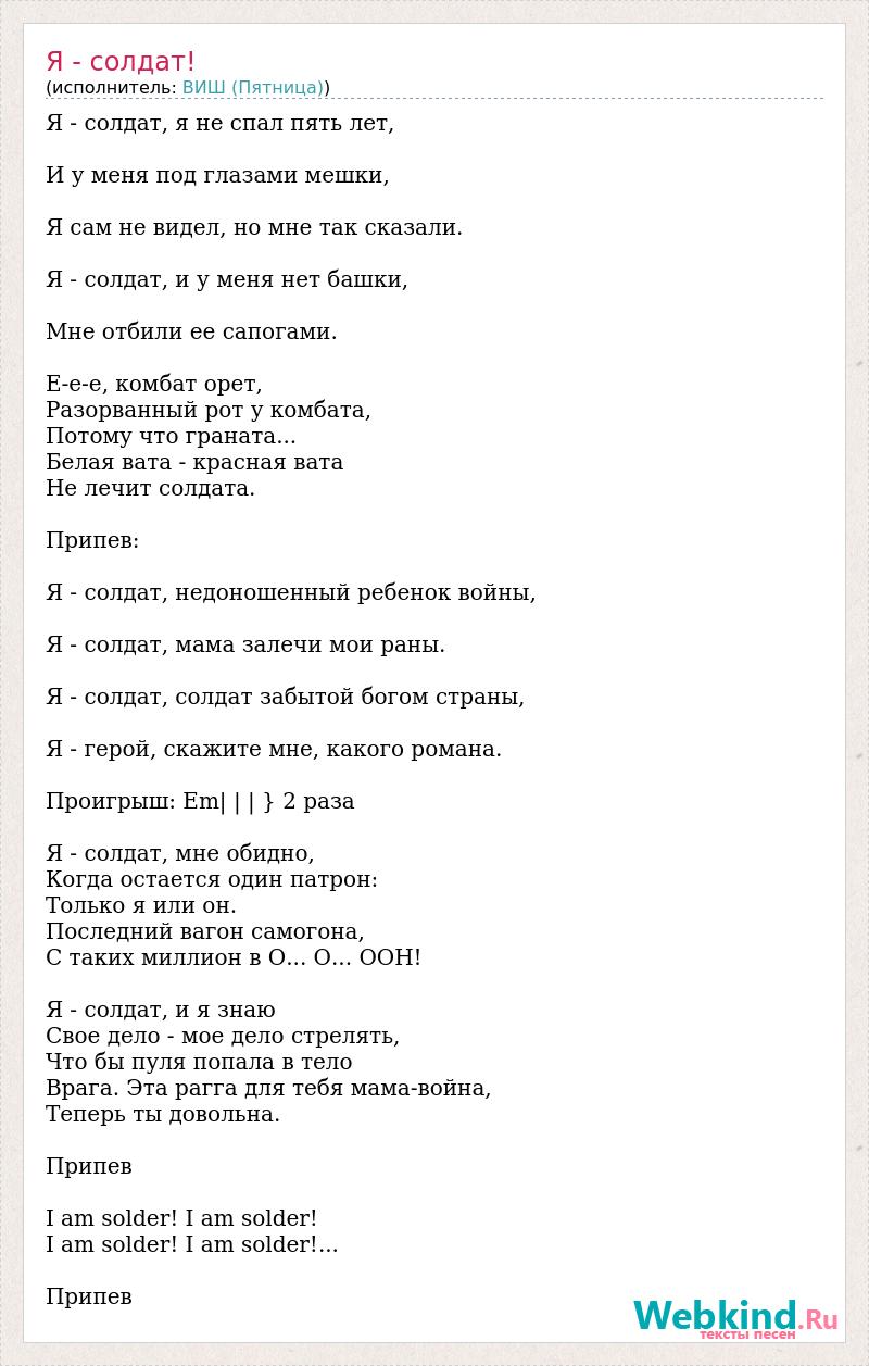 Я - солдат, я не спал пять лет, И у меня под глазами мешки, Я сам не видел, но мне так сказали. Я - солдат, и у меня нет башки, Мне отбили ее сапогами. Е-е-е, комбат орет, Разорванный рот у комбата, Потому что граната... Белая вата - красная вата Не лечит солдата. Припев: Я - солдат, недоношенный ребенок войны, Я - солдат, мама залечи мои раны. Я - солдат, солдат забытой богом страны, Я - герой, скажите мне, какого романа. Проигрыш: Em| | | } 2 раза Я - солдат, мне обидно, Когда остается один патрон: Только я или он. Последний вагон самогона, С таких миллион в О... О... ООН! Я - солдат, и я знаю Свое дело - мое дело стрелять, Что бы пуля попала в тело Врага. Эта рагга для тебя мама-война, Теперь ты довольна. Припев I am solder! I am solder! I am solder! I am solder!... Припев