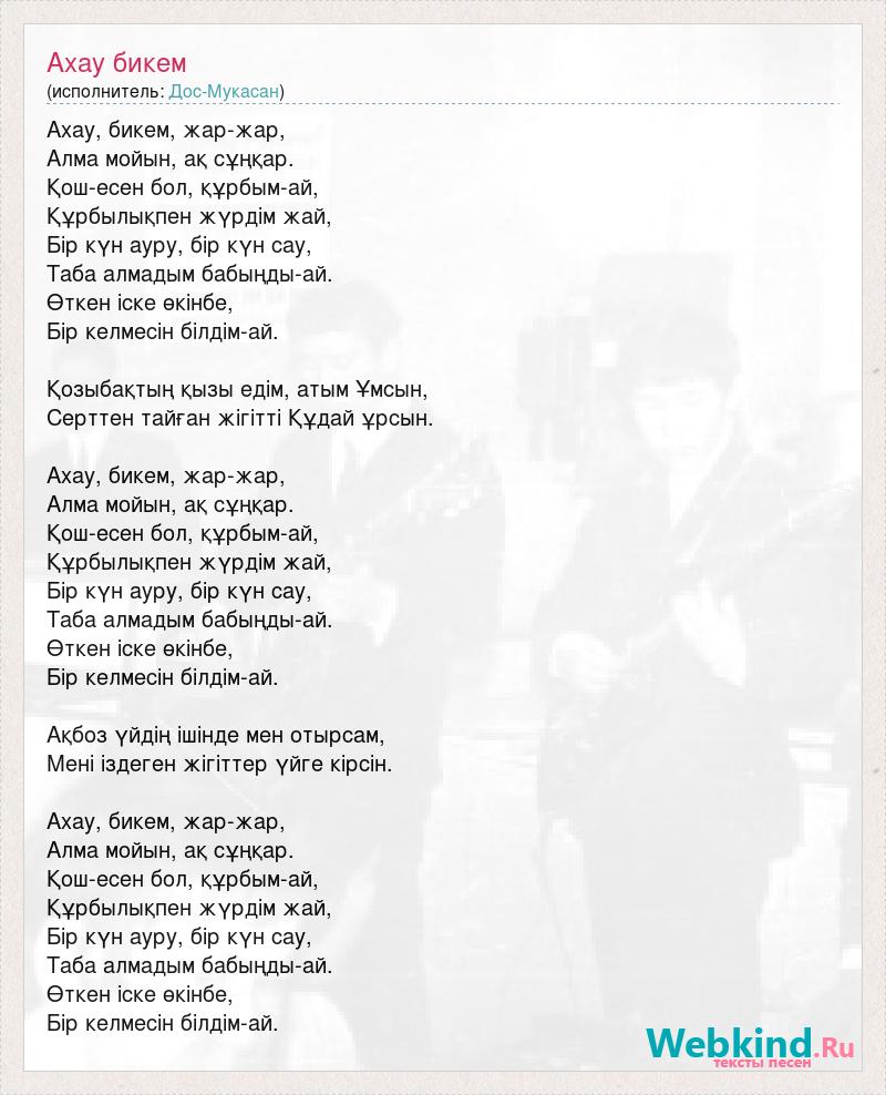 Ахау, бикем, жар-жар, Алма мойын, ақ сұңқар. Қош-есен бол, құрбым-ай, Құрбылықпен жүрдім жай, Бір күн ауру, бір күн сау, Таба алмадым бабыңды-ай. Өткен іске өкінбе, Бір келмесін білдім-ай. Қозыбақтың қызы едім, атым Ұмсын, Серттен тайған жігітті Құдай ұрсын. Ахау, бикем, жар-жар, Алма мойын, ақ сұңқар. Қош-есен бол, құрбым-ай, Құрбылықпен жүрдім жай, Бір күн ауру, бір күн сау, Таба алмадым бабыңды-ай. Өткен іске өкінбе, Бір келмесін білдім-ай. Ақбоз үйдің ішінде мен отырсам, Мені іздеген жігіттер үйге кірсін. Ахау, бикем, жар-жар, Алма мойын, ақ сұңқар. Қош-есен бол, құрбым-ай, Құрбылықпен жүрдім жай, Бір күн ауру, бір күн сау, Таба алмадым бабыңды-ай. Өткен іске өкінбе, Бір келмесін білдім-ай.