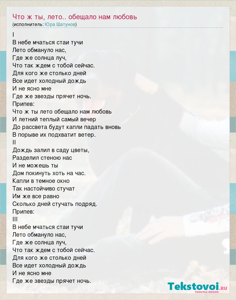 I В небе мчаться стаи тучи Лето обмануло нас, Где же солнца луч, Что так ждем с тобой сейчас. Для кого же столько дней Все идет холодный дождь И не ясно мне Где же звезды прячет ночь. Припев: Что ж ты лето обещало нам любовь И летний теплый самый вечер До рассвета будут капли падать вновь В порыве их подхватит ветер. II Дождь залил в саду цветы, Разделил стеною нас И не можешь ты Дом покинуть хоть на час. Капли в темное окно Так настойчиво стучат Им же все равно Сколько дней стучать подряд. Припев: III В небе мчаться стаи тучи Лето обмануло нас, Где же солнца луч, Что так ждем с тобой сейчас. Для кого же столько дней Все идет холодный дождь И не ясно мне Где же звезды прячет ночь.