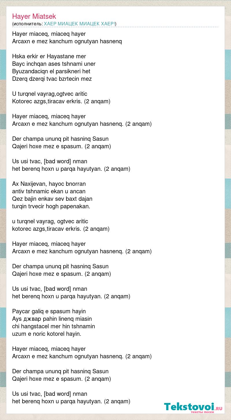 Hayer miaceq, miaceq hayer Arcaxn e mez kanchum ognutyan hasnenq Hska erkir er Hayastane mer Bayc inchqan ases tshnami uner Byuzandaciqn el parsikneri het Dzerq dzerqi tvac bzrtecin mez U turqnel vayrag,ogtvec aritic Kotorec azgs,tiracav erkris. (2 anqam) Hayer miaceq, miaceq hayer Arcaxn e mez kanchum ognutyan hasnenq. (2 anqam) Der champa ununq pit hasninq Sasun Qajeri hoxe mez e spasum. (2 anqam) Us usi tvac, ayruci nman het berenq hoxn u parqa hayutyan. (2 anqam) Ax Naxijevan, hayoc bnorran antiv tshnamic ekan u ancan Qez bajin enkav sev baxt dajan turqin trvecir hogh papenakan. u turqnel vayrag, ogtvec aritic kotorec azgs,tiracav erkris. (2 anqam) Hayer miaceq, miaceq hayer Arcaxn e mez kanchum ognutyan hasnenq. (2 anqam) Der champa ununq pit hasninq Sasun Qajeri hoxe mez e spasum. (2 anqam) Us usi tvac, ayruci nman het berenq hoxn u parqa hayutyan. (2 anqam) Paycar galiq e spasum hayin Ays джвар pahin linenq miasin chi hangstacel mer hin tshnamin uzum e noric kotorel hayin. Hayer miaceq, miaceq hayer Arcaxn e mez kanchum ognutyan hasnenq. (2 anqam) Der champa ununq pit hasninq Sasun Qajeri hoxe mez e spasum. (2 anqam) Us usi tvac, ayruci nman het berenq hoxn u parqa hayutyan. (2 anqam)