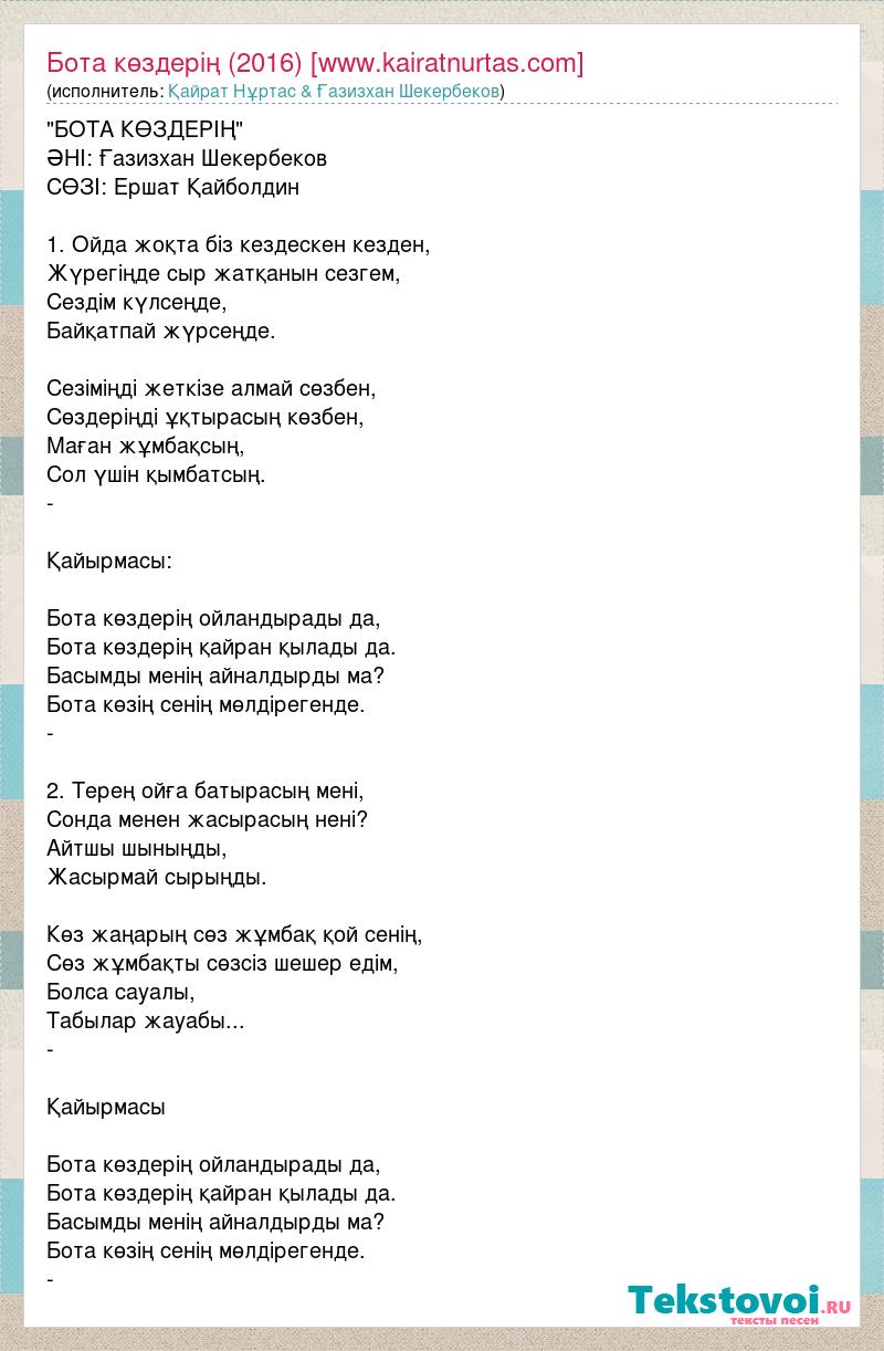 "БОТА КӨЗДЕРІҢ" ƏНІ: Ғазизхан Шекербеков СӨЗІ: Ершат Қайболдин 1. Ойда жоқта біз кездескен кезден, Жүрегіңде сыр жатқанын сезгем, Сездім күлсеңде, Байқатпай жүрсеңде. Сезіміңді жеткізе алмай сөзбен, Сөздеріңді ұқтырасың көзбен, Маған жұмбақсың, Сол үшін қымбатсың. - Қайырмасы: Бота көздерің ойландырады да, Бота көздерің қайран қылады да. Басымды менің айналдырды ма? Бота көзің сенің мөлдірегенде. - 2. Терең ойға батырасың мені, Сонда менен жасырасың нені? Айтшы шыныңды, Жасырмай сырыңды. Көз жаңарың сөз жұмбақ қой сенің, Сөз жұмбақты сөзсіз шешер едім, Болса сауалы, Табылар жауабы... - Қайырмасы Бота көздерің ойландырады да, Бота көздерің қайран қылады да. Басымды менің айналдырды ма? Бота көзің сенің мөлдірегенде. -
