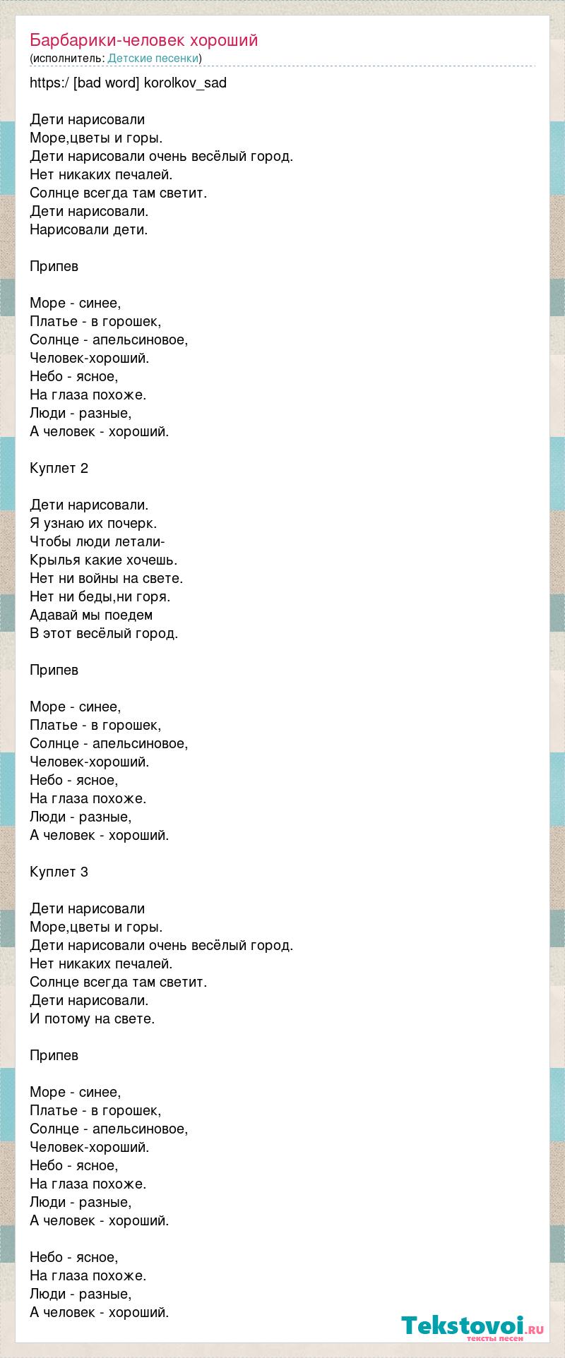 https:/ [bad word] korolkov_sad Дети нарисовали Море,цветы и горы. Дети нарисовали очень весёлый город. Нет никаких печалей. Солнце всегда там светит. Дети нарисовали. Нарисовали дети. Припев Море - синее, Платье - в горошек, Солнце - апельсиновое, Человек-хороший. Небо - ясное, На глаза похоже. Люди - разные, А человек - хороший. Куплет 2 Дети нарисовали. Я узнаю их почерк. Чтобы люди летали- Крылья какие хочешь. Нет ни войны на свете. Нет ни беды,ни горя. Адавай мы поедем В этот весёлый город. Припев Море - синее, Платье - в горошек, Солнце - апельсиновое, Человек-хороший. Небо - ясное, На глаза похоже. Люди - разные, А человек - хороший. Куплет 3 Дети нарисовали Море,цветы и горы. Дети нарисовали очень весёлый город. Нет никаких печалей. Солнце всегда там светит. Дети нарисовали. И потому на свете. Припев Море - синее, Платье - в горошек, Солнце - апельсиновое, Человек-хороший. Небо - ясное, На глаза похоже. Люди - разные, А человек - хороший. Небо - ясное, На глаза похоже. Люди - разные, А человек - хороший.